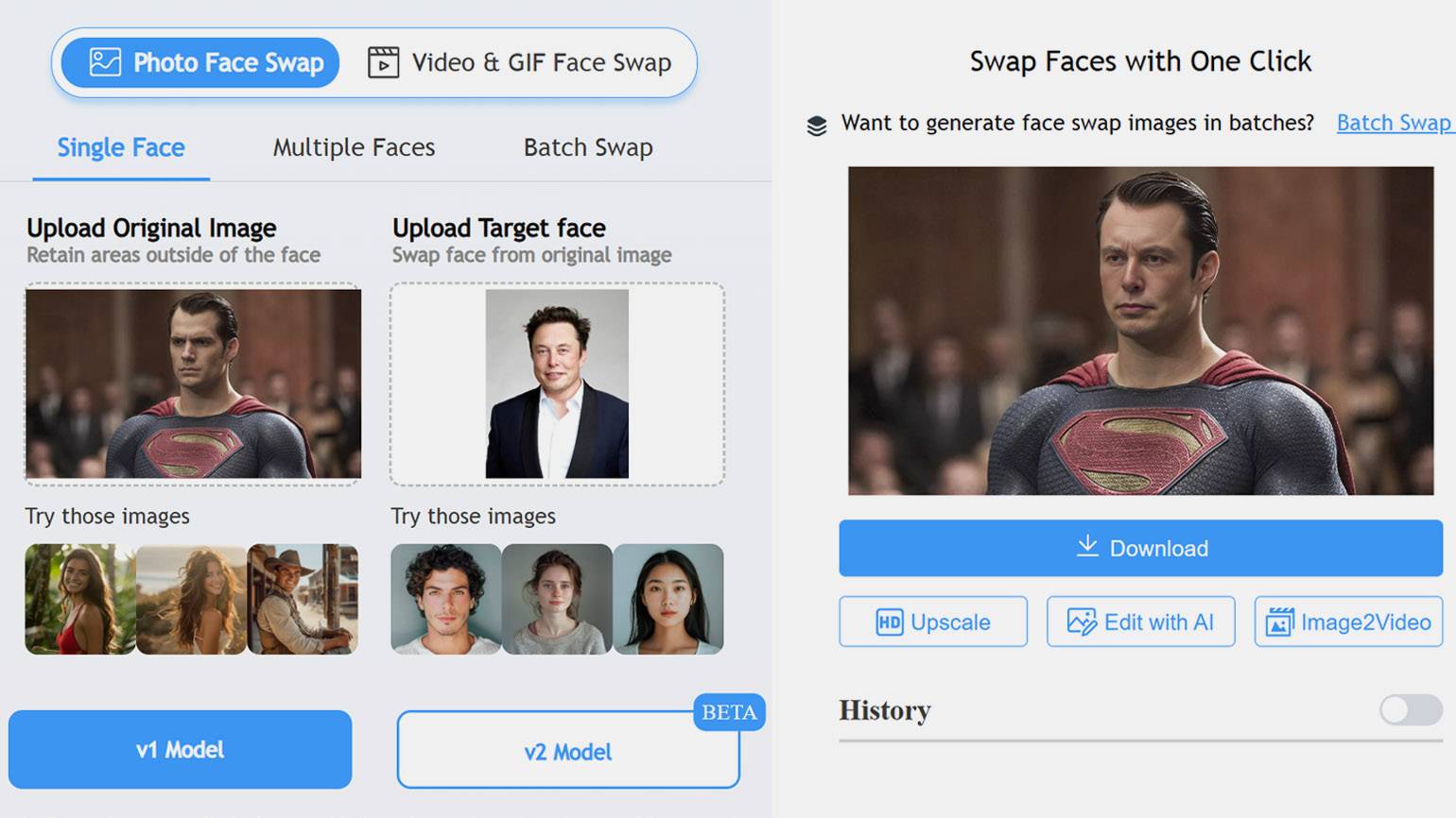 Ещё один сервис для замены лица на фото и видео. Платформа работает онлайн и поддерживает обработку нескольких изображений подряд. Для лучшего результата используйте изображения высокого качества без сильных теней.