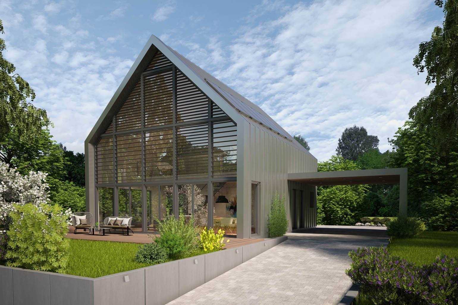 Дома в стиле барнхаус легко узнать благодаря простой, обычно прямоугольной форме, двускатной крыше и панорамному остеклению. Наружная отделка чаще всего состоит из металла и дерева.