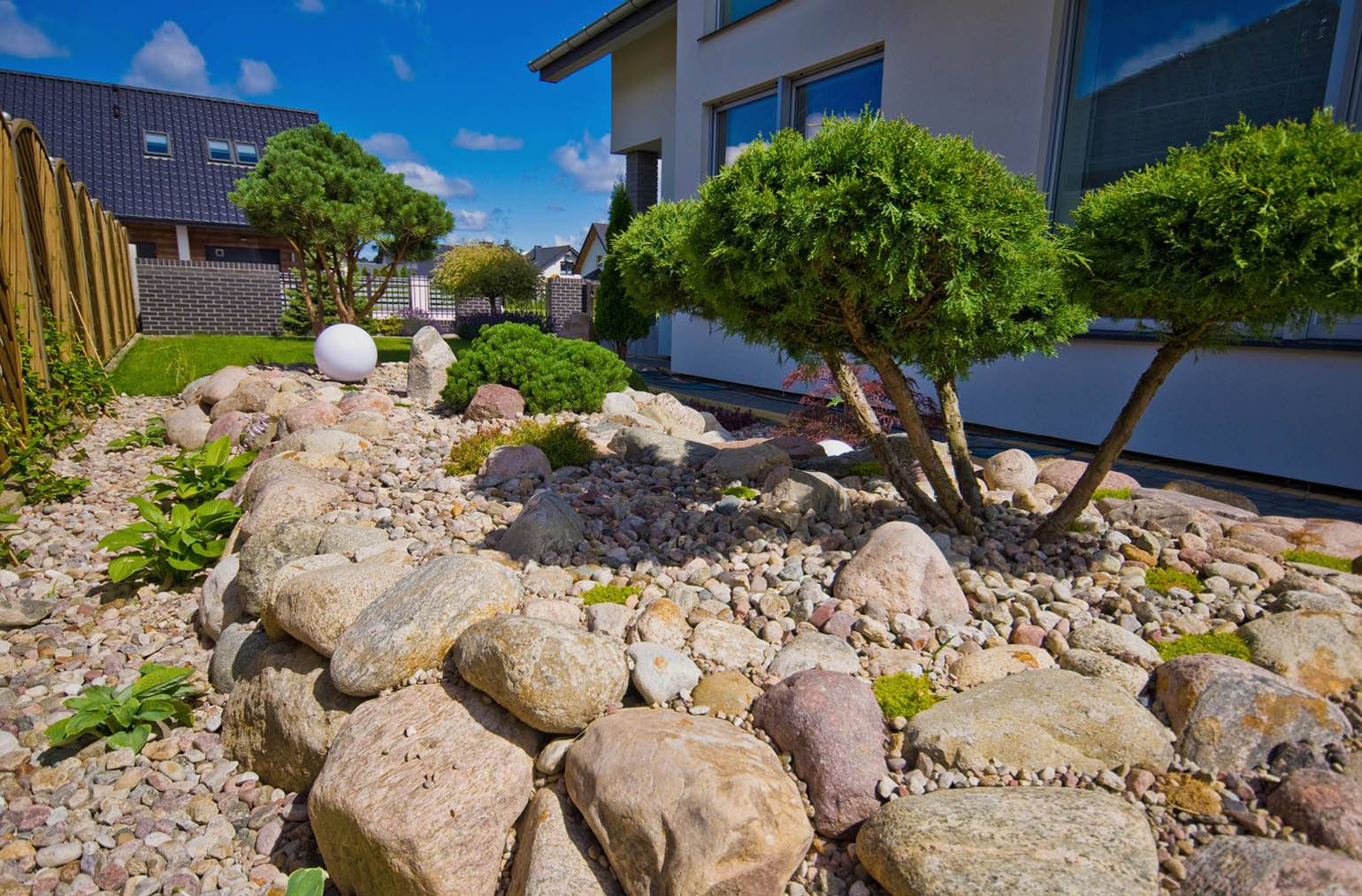 Выбор рокария зависит и от рельефа участка: на крутом склоне подойдёт горный тип с крупными валунами и хвойными растениями, на холме, например, террасный тип с утопленными камнями, тропинками и почвопокровными растениями, а на ровной поверхности — ландшафтный, с акцентом на зелени между валунами.