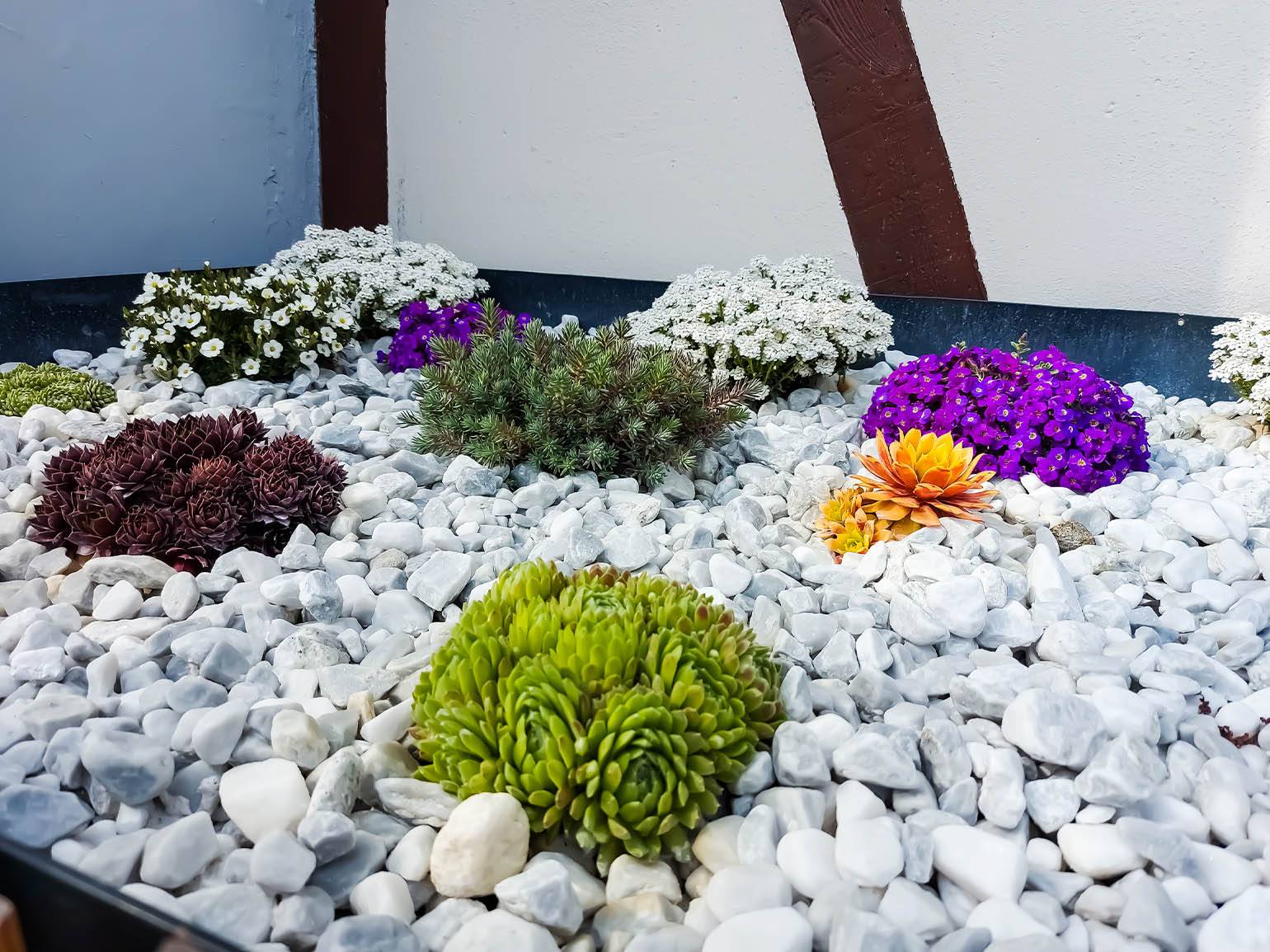 Многие используют простой острый известняковый щебень или гранитную крошку с острыми краями. Проблема в том, что строительный щебень со временем слёживается в монолит, в нём плохо дышат корни, а острые углы травмируют стелющиеся растения. К тому же на нём быстро растут сорняки, которые невозможно выполоть, не перекопав весь камень. Лучше использовать окатанную гальку или гравий с округлыми формами — он лучше пропускает воздух и выглядит естественнее.