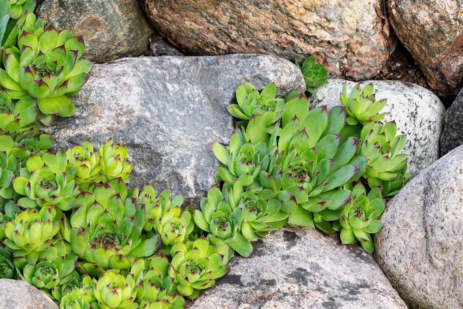 • Молодило, или каменная роза, — создано для рокариев. Аккуратной формы, совершенно не требовательное к почве, прекрасно переносит засуху и морозы. В дикой природе растёт между скал, хорошо смотрится среди пористого туфа или песчаника.