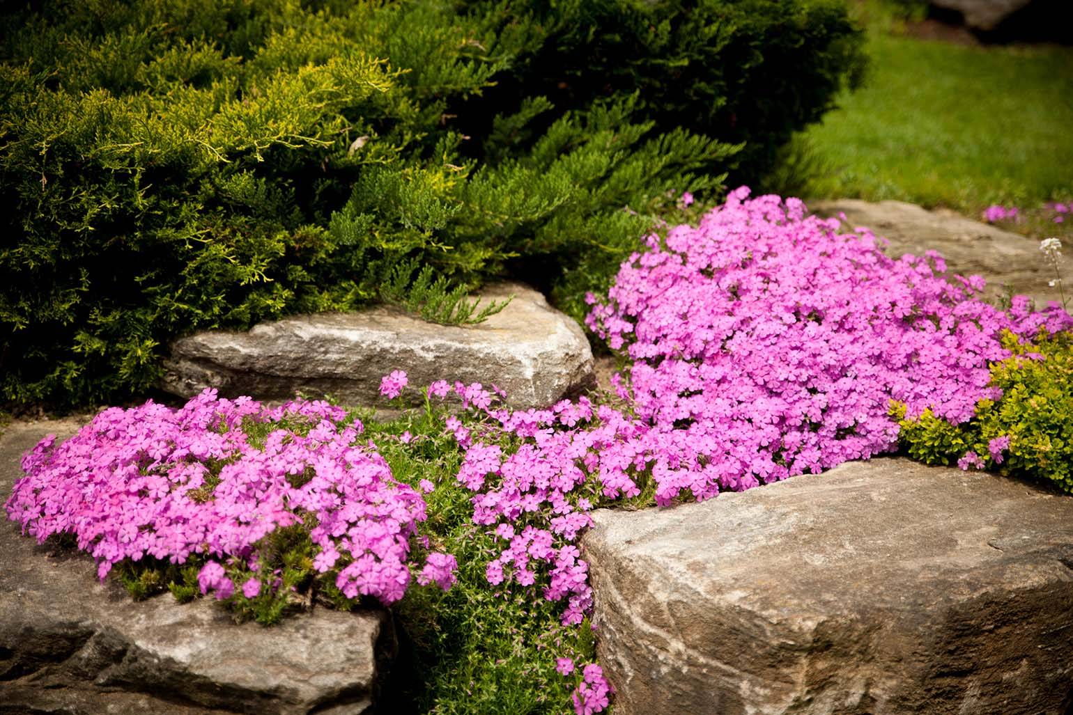 • Флоксы шиловидные обильно цветут весной и летом, стекая красивым водопадом с крупных валунов.