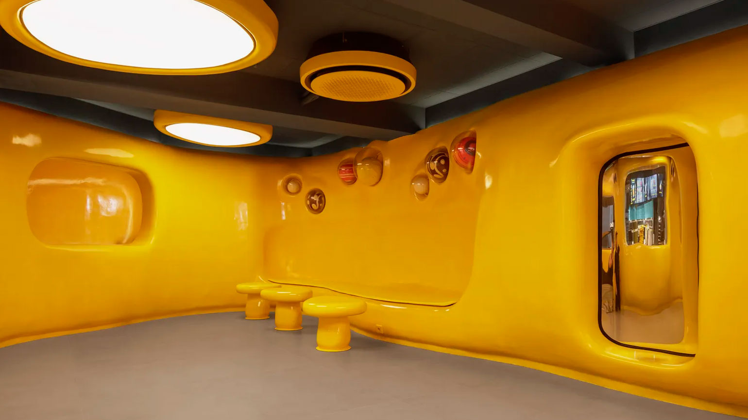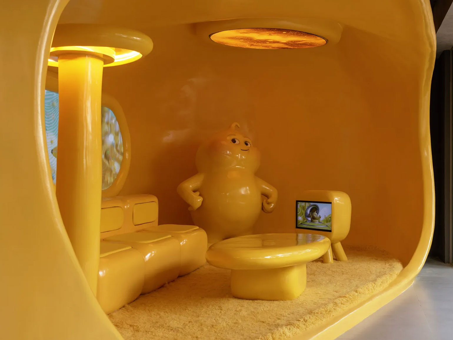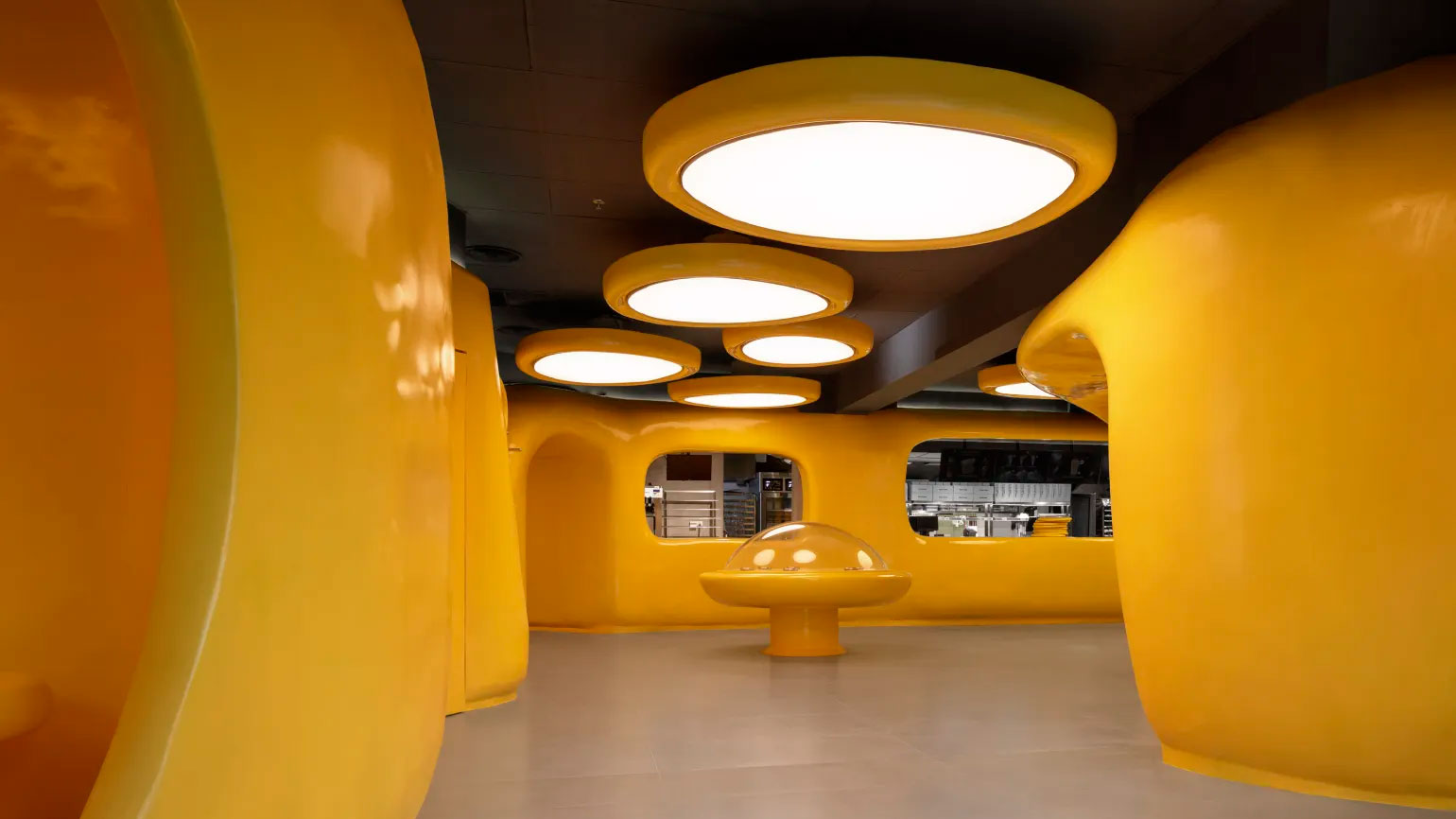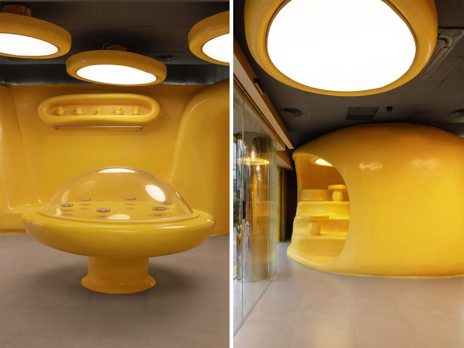 Дизайн пространства разработала команда Crosby Studios, пишет издание «Interior+Design». Их цель — создать место, где можно на время покинуть привычную реальность и оказаться в фантазийном мире. Интерьер построен вокруг серии жёлтых объектов с плавными, почти инопланетными формами. Они блестят в мягком свете таких же необычных ламп, а внутри этих блоков вырезаны полки, сиденья и столики. Центр помещения занимает витрина, напоминающая летающую тарелку, — со стеклянным куполом и парящими хромированными подставками для десертов.