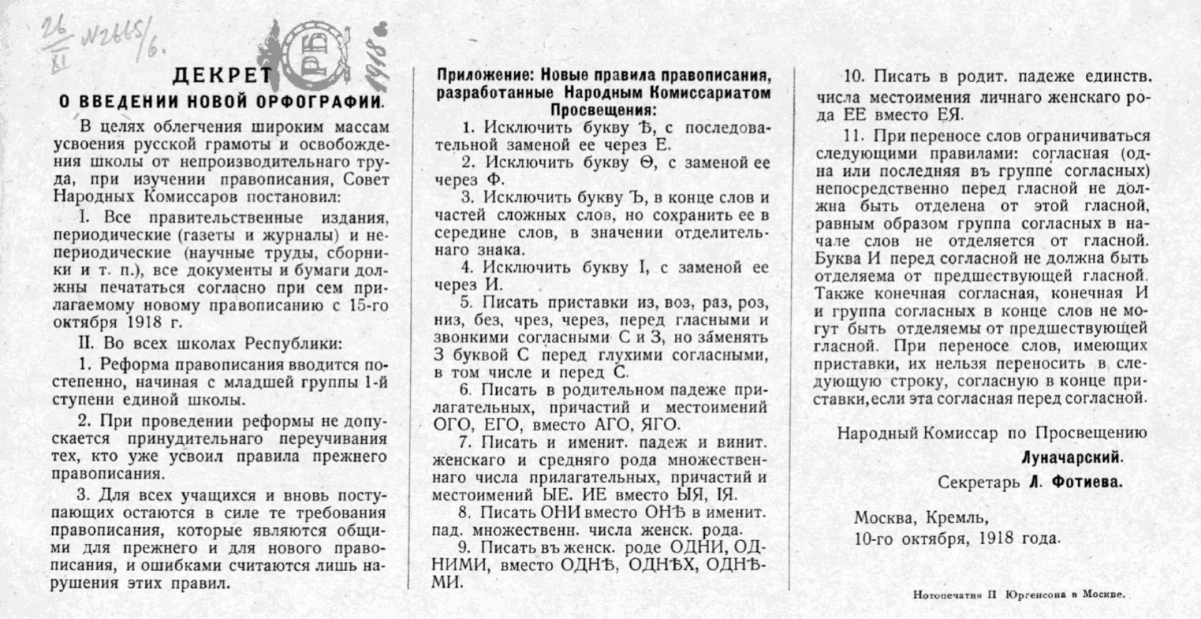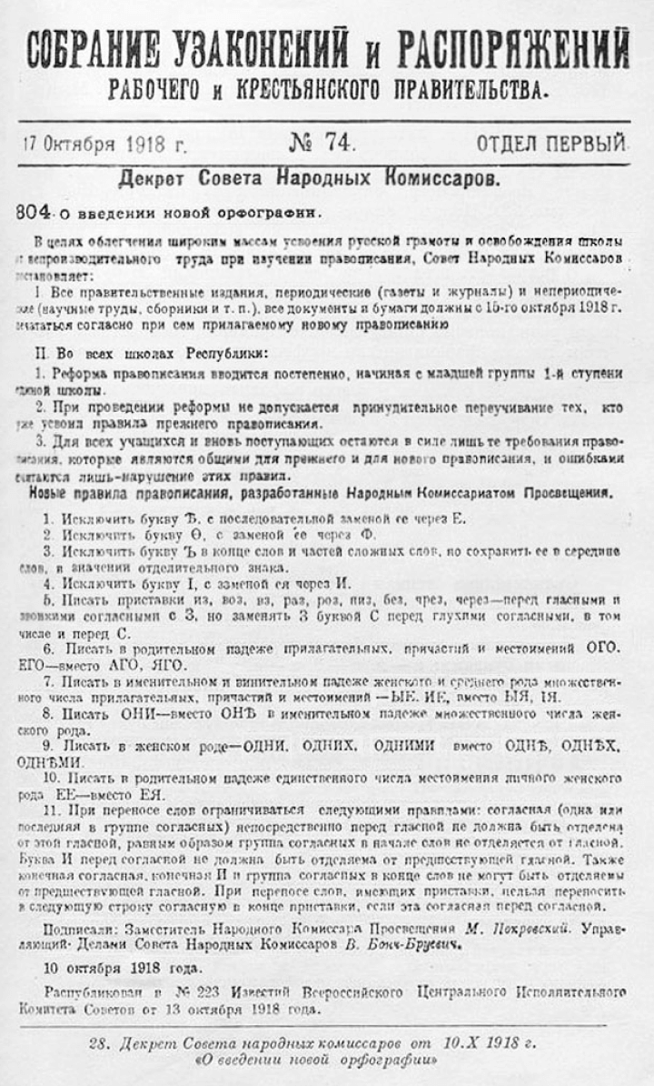Правила орфографии, которые знали миллионы людей, перестали работать. Особенно непросто было перестроиться и подчиниться новому закону некоторым типографиям. Но власть была категорична: в ноябре вышел новый декрет, в котором предписывалось изымать буквы ять, фита, i из касс наборных машинок.