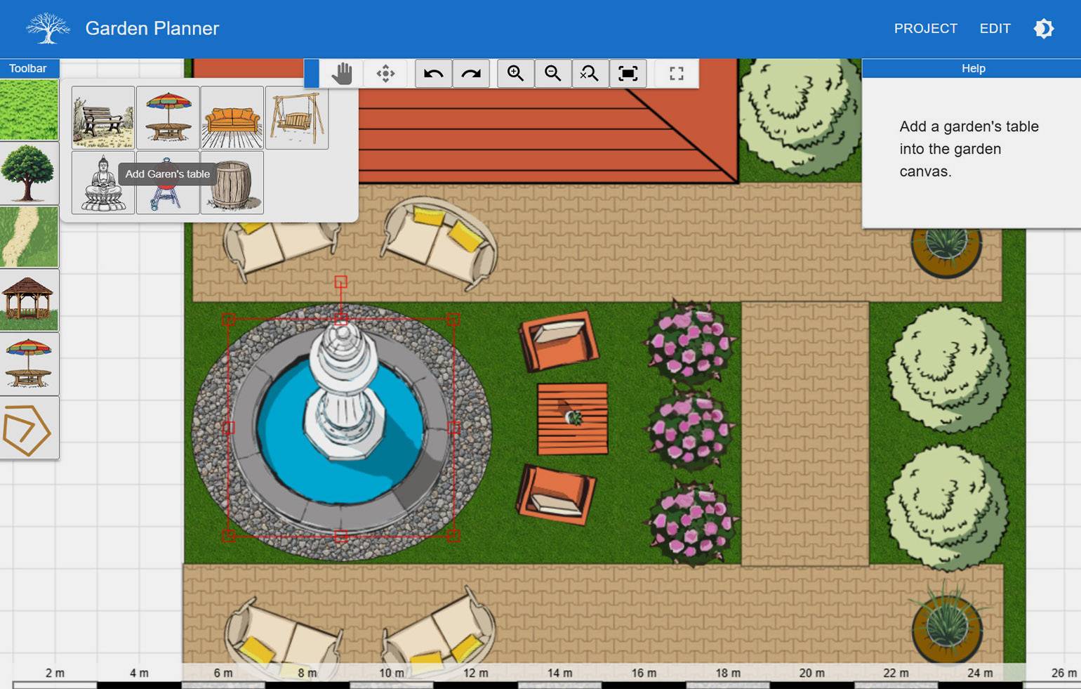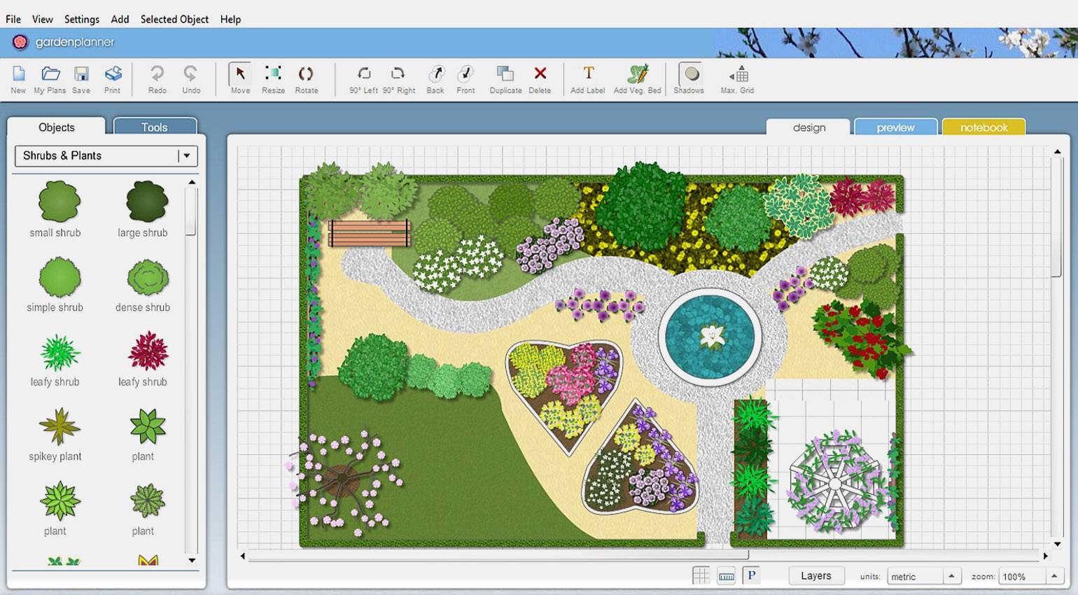 Это программа рассчитана именно под проектирование садов и участков. Она отлично подходит для планирования клумб, грядок, дорожек и зон озеленения. Сервис позволяет собрать схему участка, расставить растения с учётом расстояний и размеров, а также подготовить список используемых элементов.