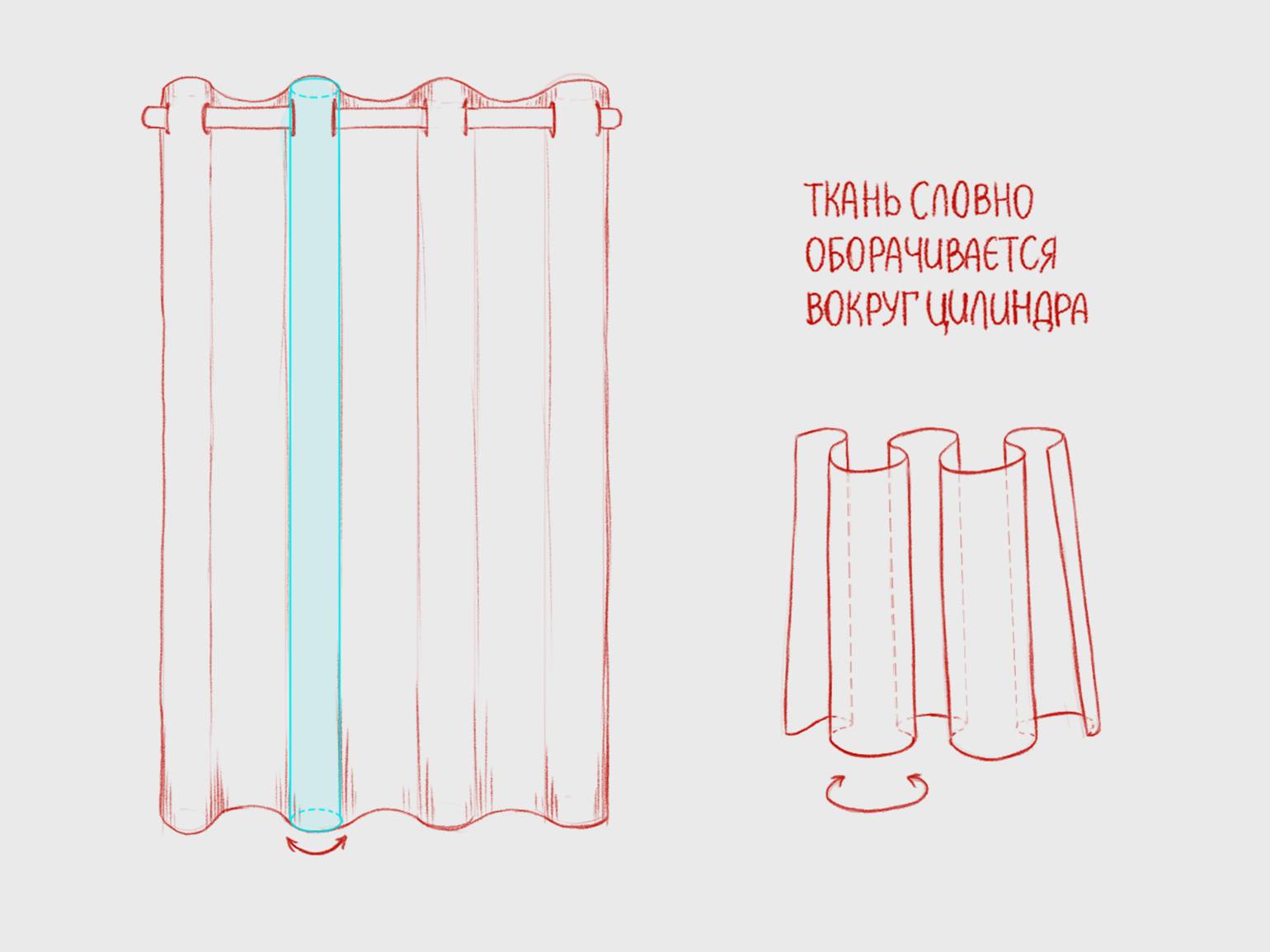 Образуются на тканях с одной точкой напряжения. В чистом виде такие складки напоминают половинки цилиндров, потому что заворачиваются по окружности. Самый классический пример — занавески. В этом случае у каждой складки есть своя индивидуальная точка напряжения на карнизе.