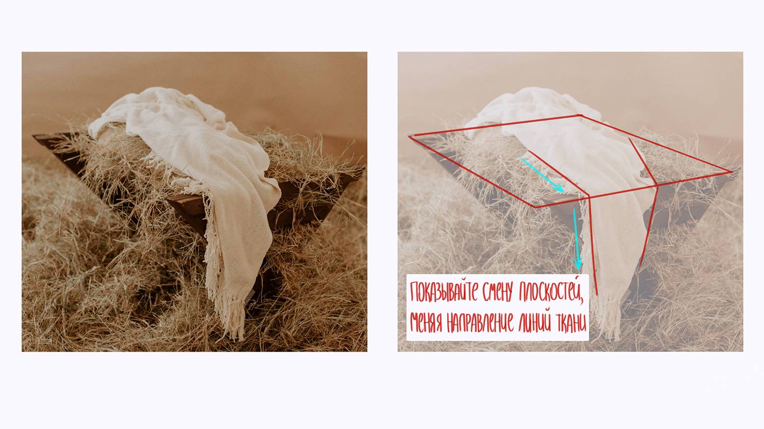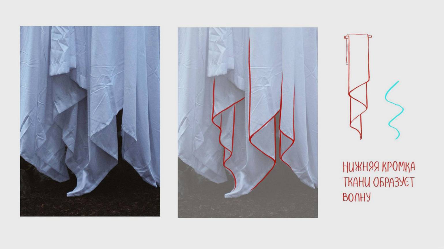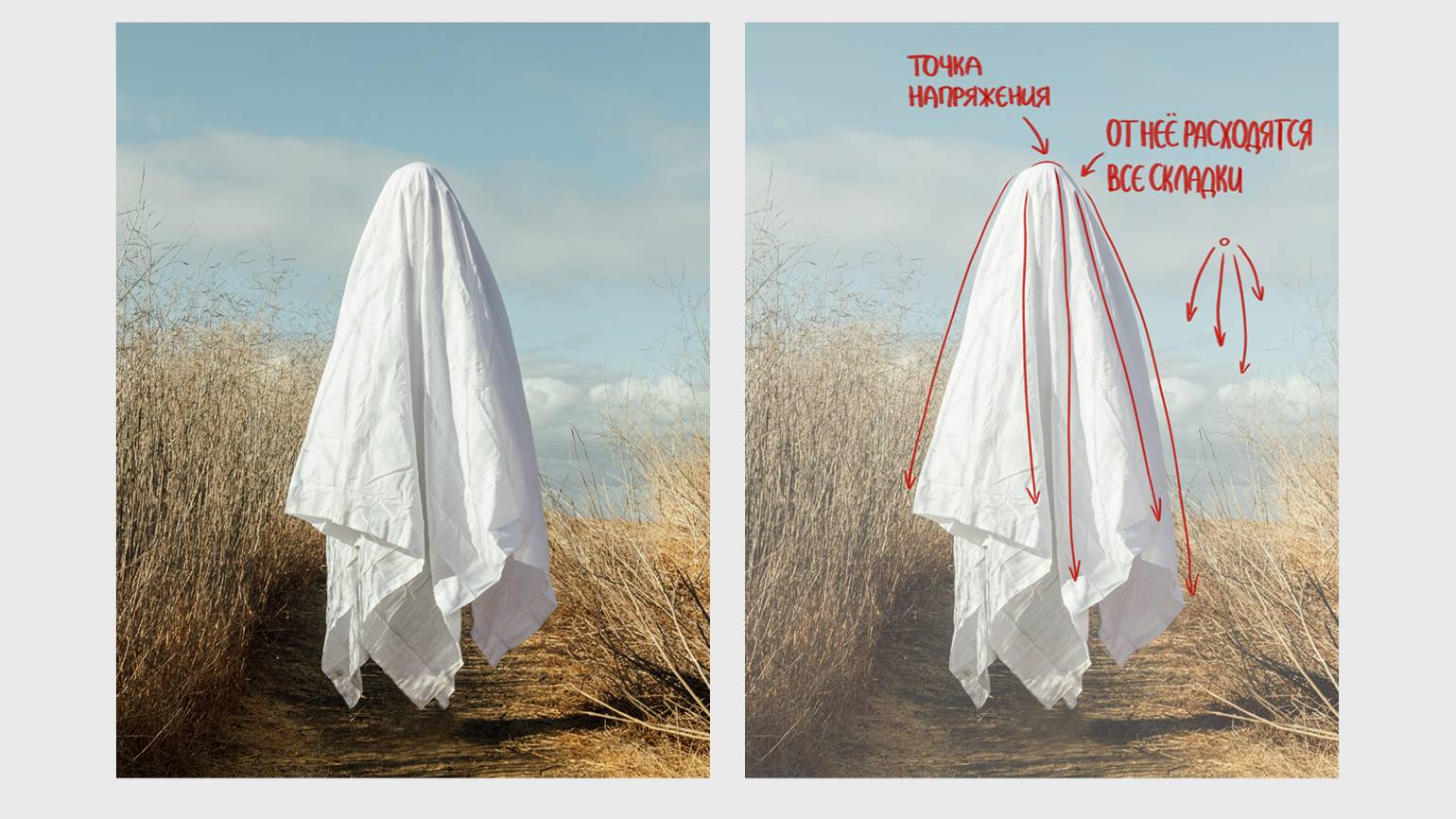 Это непредсказуемые складки на спокойно лежащей ткани. Они получаются случайным образом — например, если бросить ткань на пол — поэтому с ними сложно вывести единый алгоритм рисования. Что тут важно: