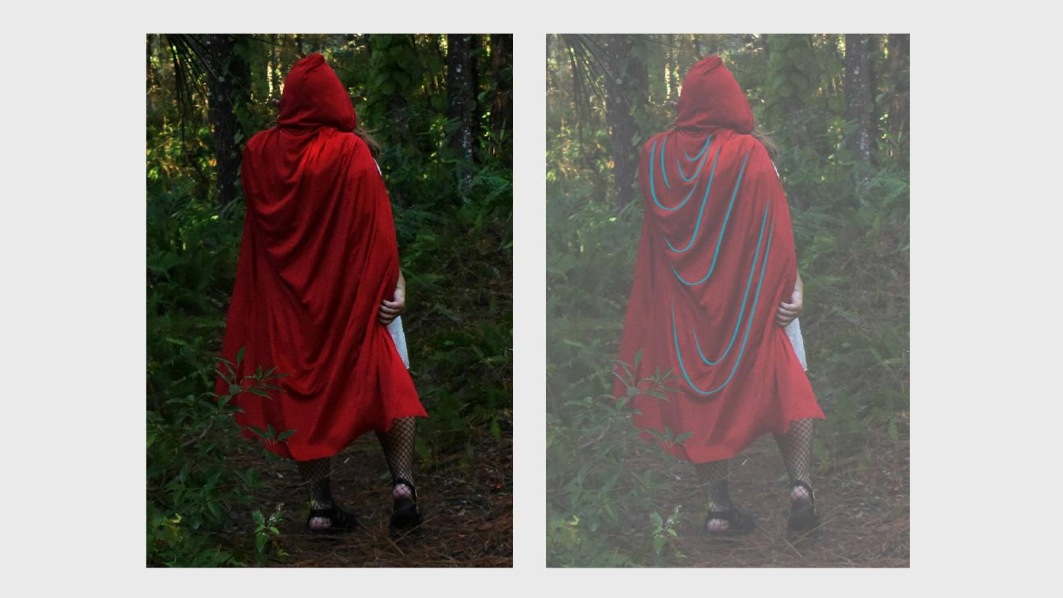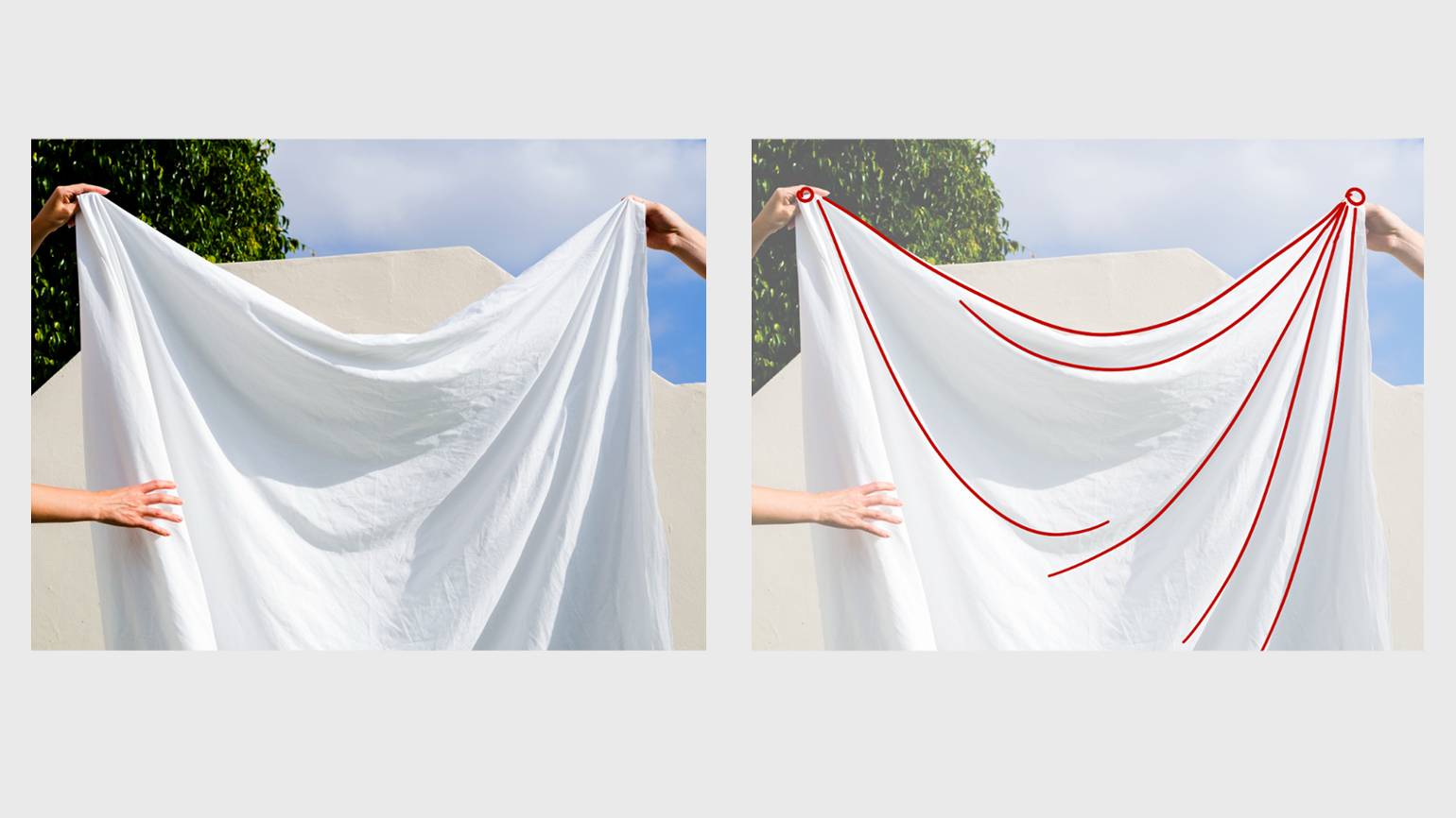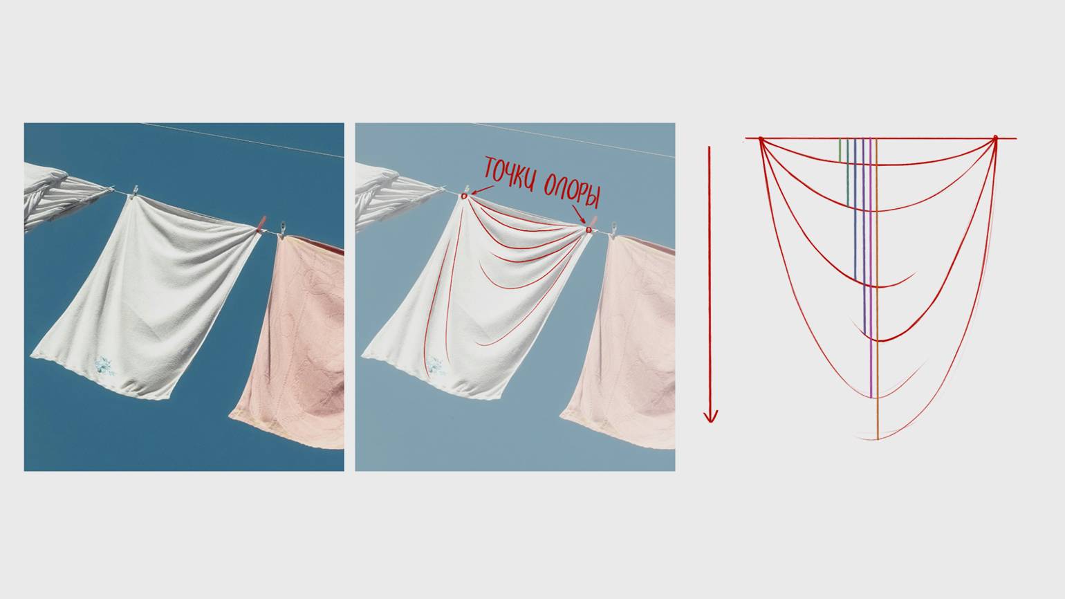 Это непредсказуемые складки на спокойно лежащей ткани. Они получаются случайным образом — например, если бросить ткань на пол — поэтому с ними сложно вывести единый алгоритм рисования. Что тут важно: