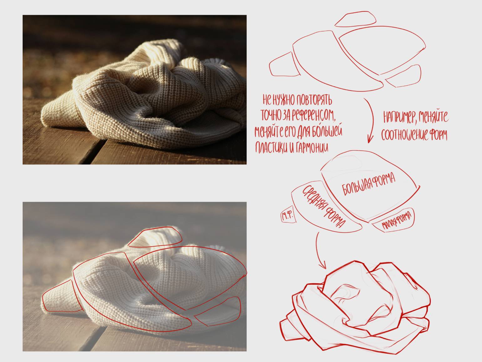 - Со складками важно не переусложнить — лучше чуть упростить и обобщить, чтобы передать суть складки, а не вырисовывать каждый штрих.