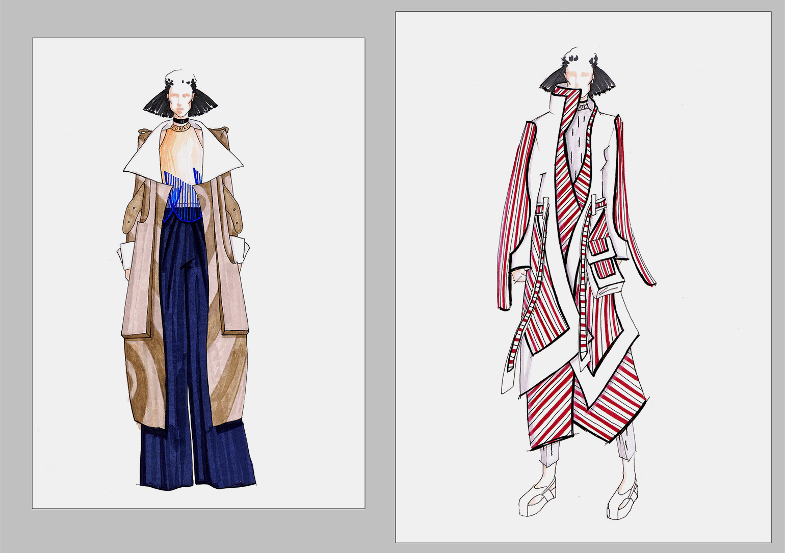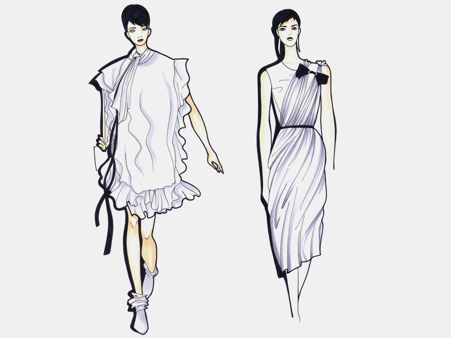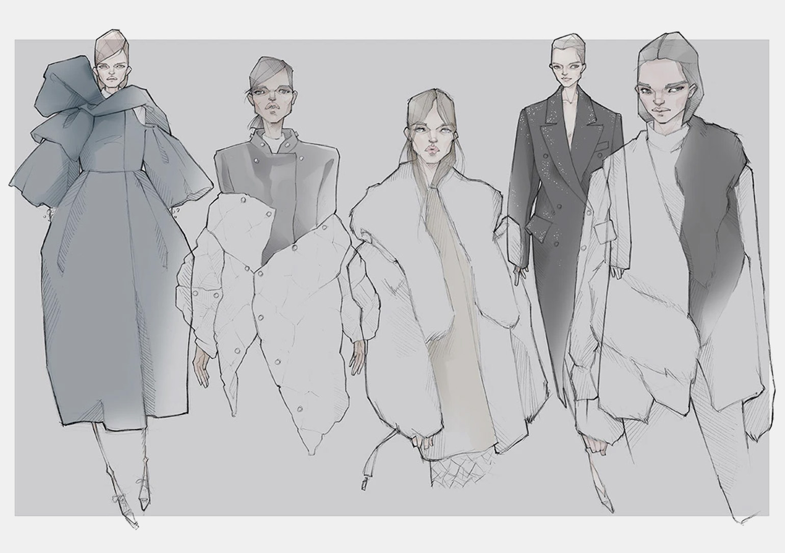 В хорошем эскизе читается не только форма, но и поведение вещи. Видно, из какого она материала, как держит форму, как реагирует на движение. Это показывают за счёт пропорций, линий и складок. Поэтому одежду почти всегда рисуют на фигуре. Так легче понять, где она опирается на тело, где отходит от него и как меняется в движении.