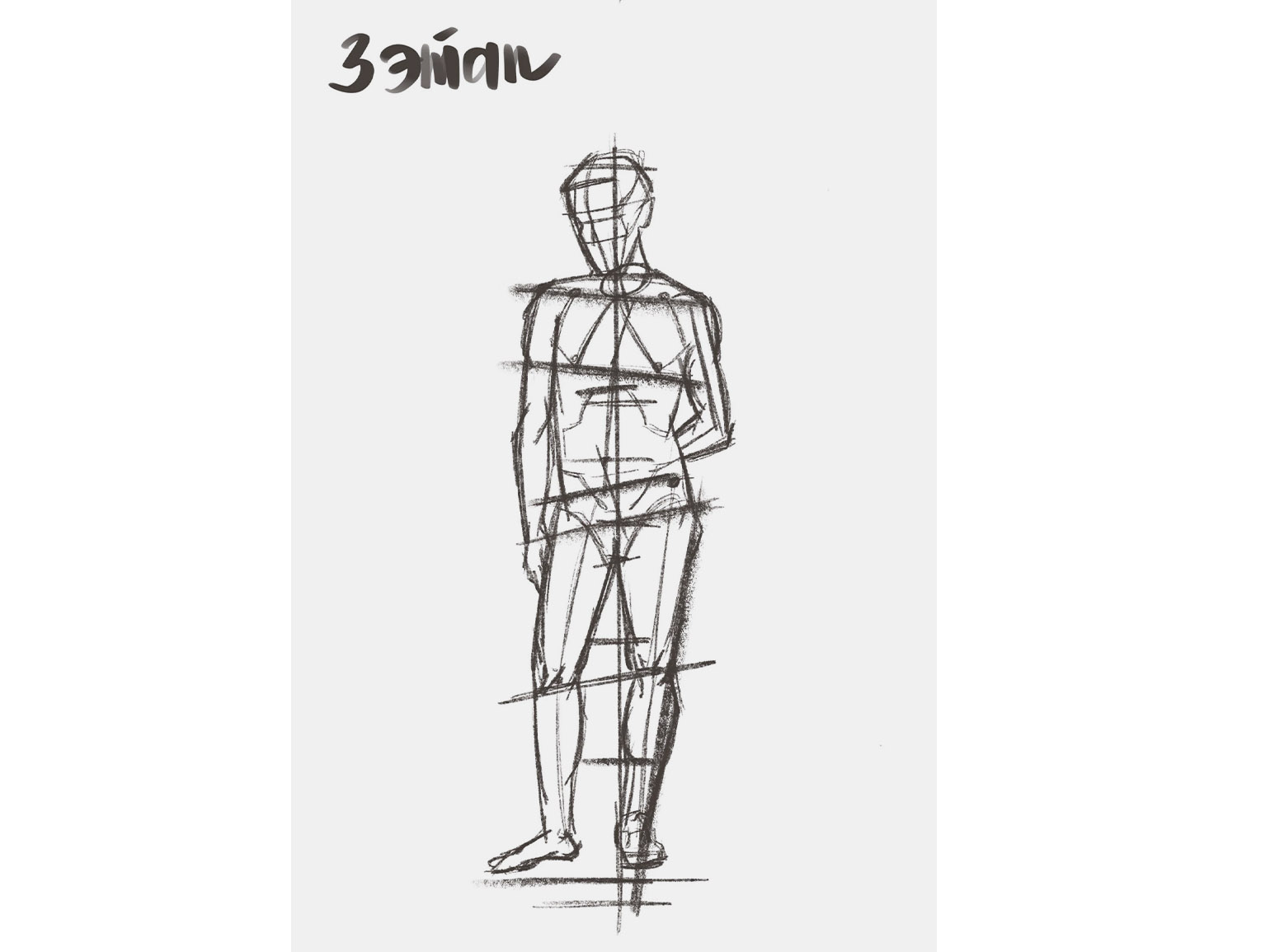 Фигуру удобно разбирать на простые формы. Таз можно наметить как трапецию, грудную клетку — как перевёрнутую трапецию, голову — как овал. Руки и ноги сначала задают линиями и простыми цилиндрами — этого достаточно, чтобы выстроить движение и пропорции.