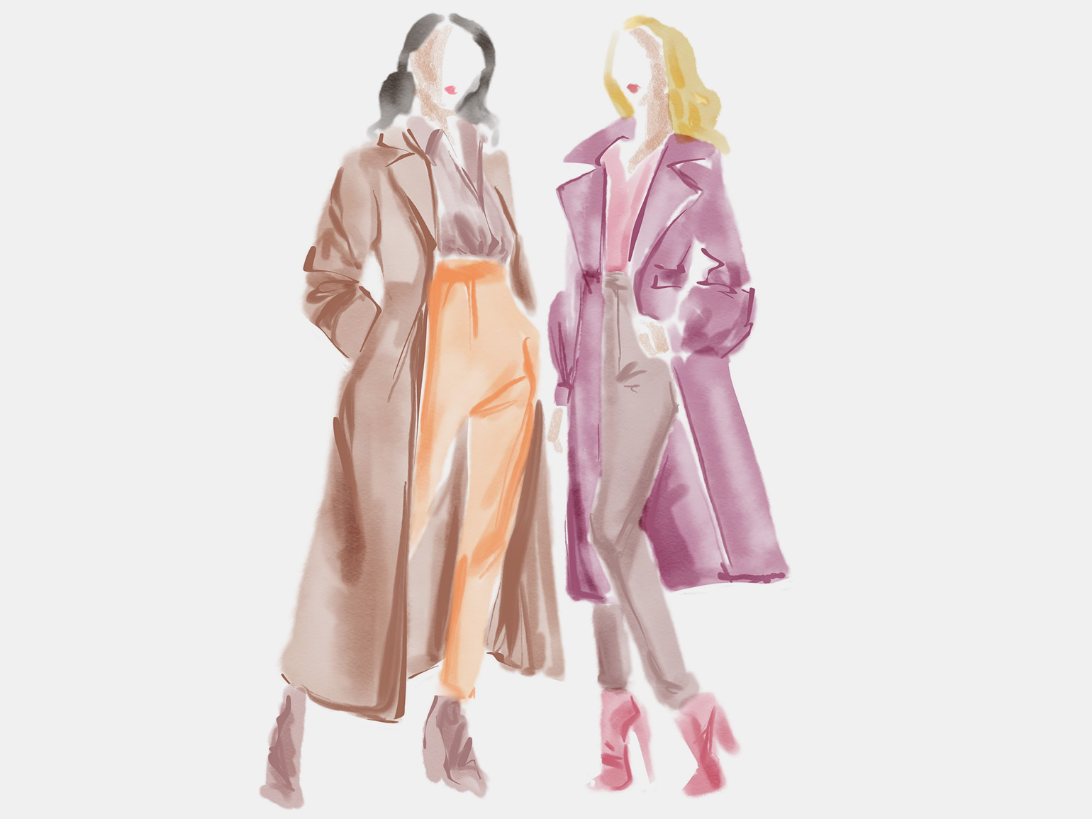 Базовое понимание фигуры нужно — без него сложно передать, как вещь сидит и держится на теле. Но это не значит, что требуется академический рисунок на уровне портрета. Для fashion-иллюстрации достаточно простой схемы: пропорция около 8 голов, основные объёмы — грудная клетка, таз, конечности как цилиндры — и общее движение фигуры. Во многих случаях фигура остаётся условной и вытянутой: она скорее помогает показать одежду, чем точно передаёт анатомию.