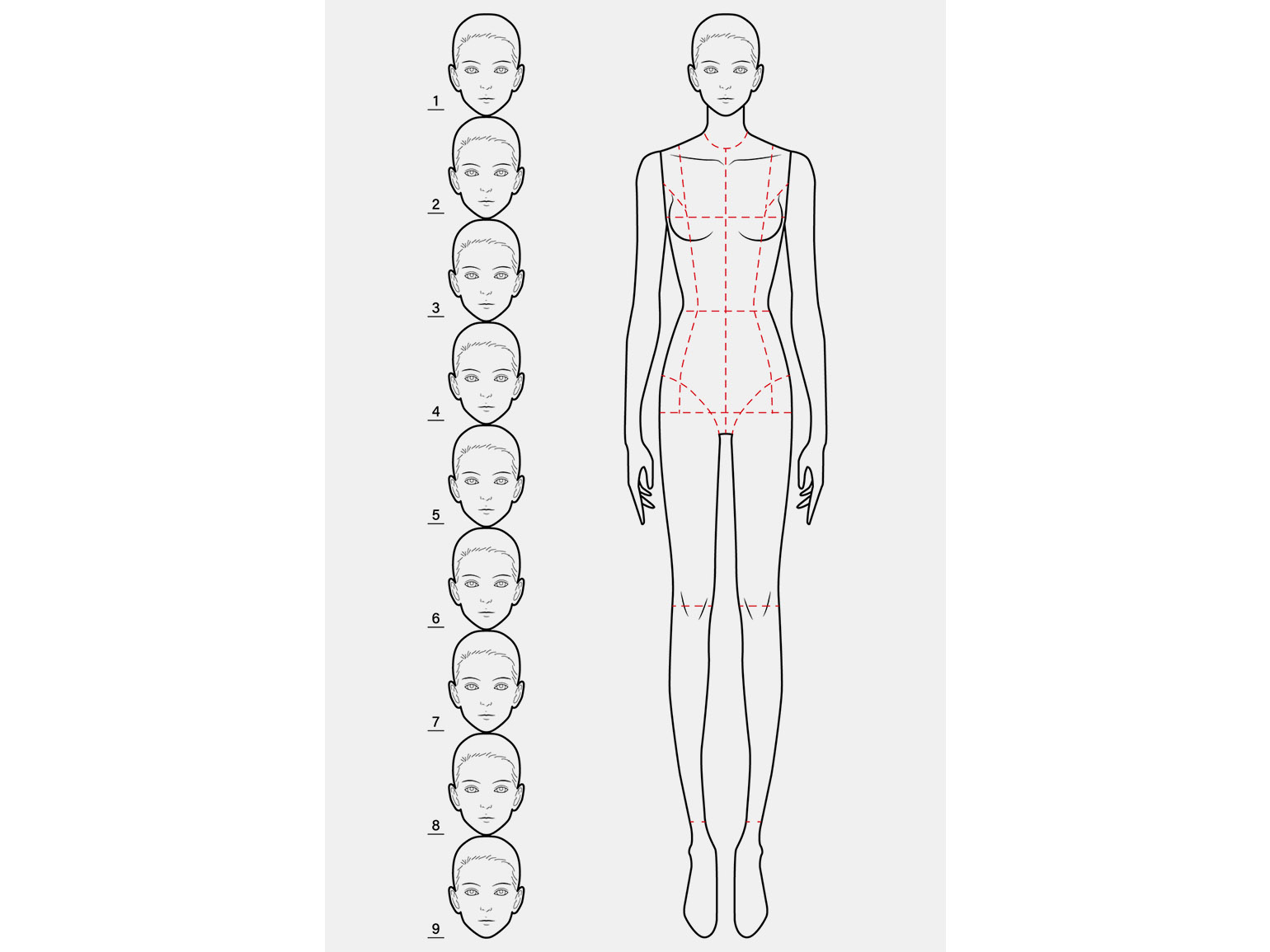 Рост удобно делить на высоту головы. В среднем фигура взрослого человека укладывается в 7,5–8 голов. В академическом рисунке чаще используют пропорцию 7,5 головы. В модной иллюстрации и при изображении героических персонажей фигуру вытягивают — до 8, иногда 8,5–9 голов.