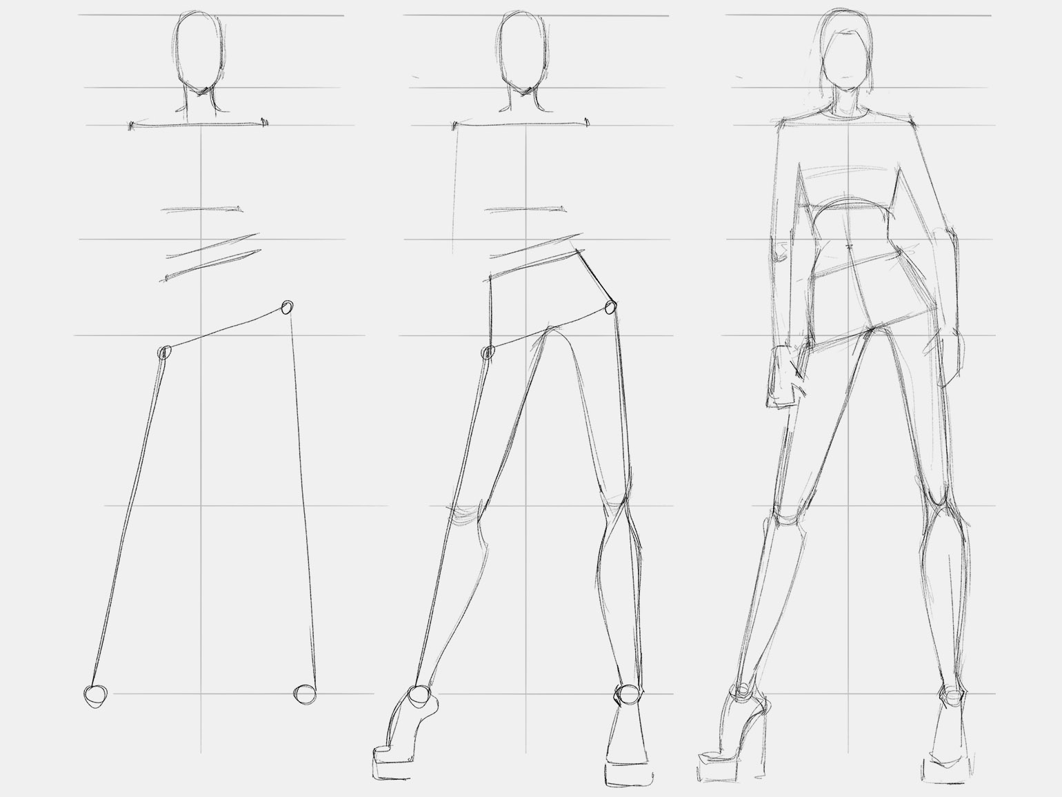 Линию роста делят пополам: верхняя часть — торс и голова, нижняя — ноги. В fashion-эскизах пропорции часто смещают — ноги делают длиннее, чем в реальности, иногда почти на 5/7 от всего роста.