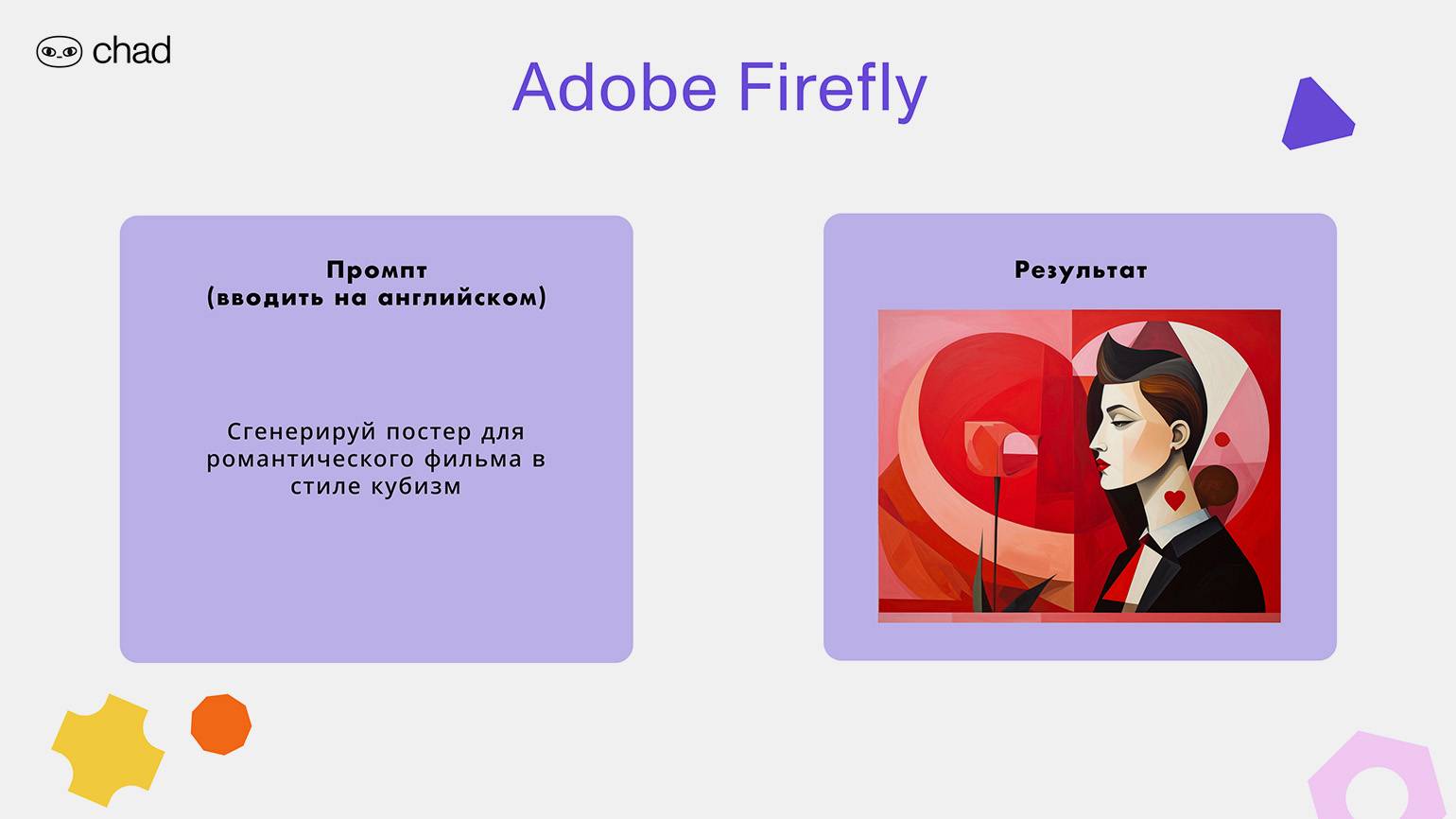 Firefly — семейство моделей от Adobe, интегрированное в Photoshop, Illustrator и другие продукты Creative Cloud, с акцентом на безопасное коммерческое использование и тесную связь с привычными инструментами дизайнера. Оно создано скорее как дополнительный инструмент для ускорения, чем как отдельный экспериментальный генератор.