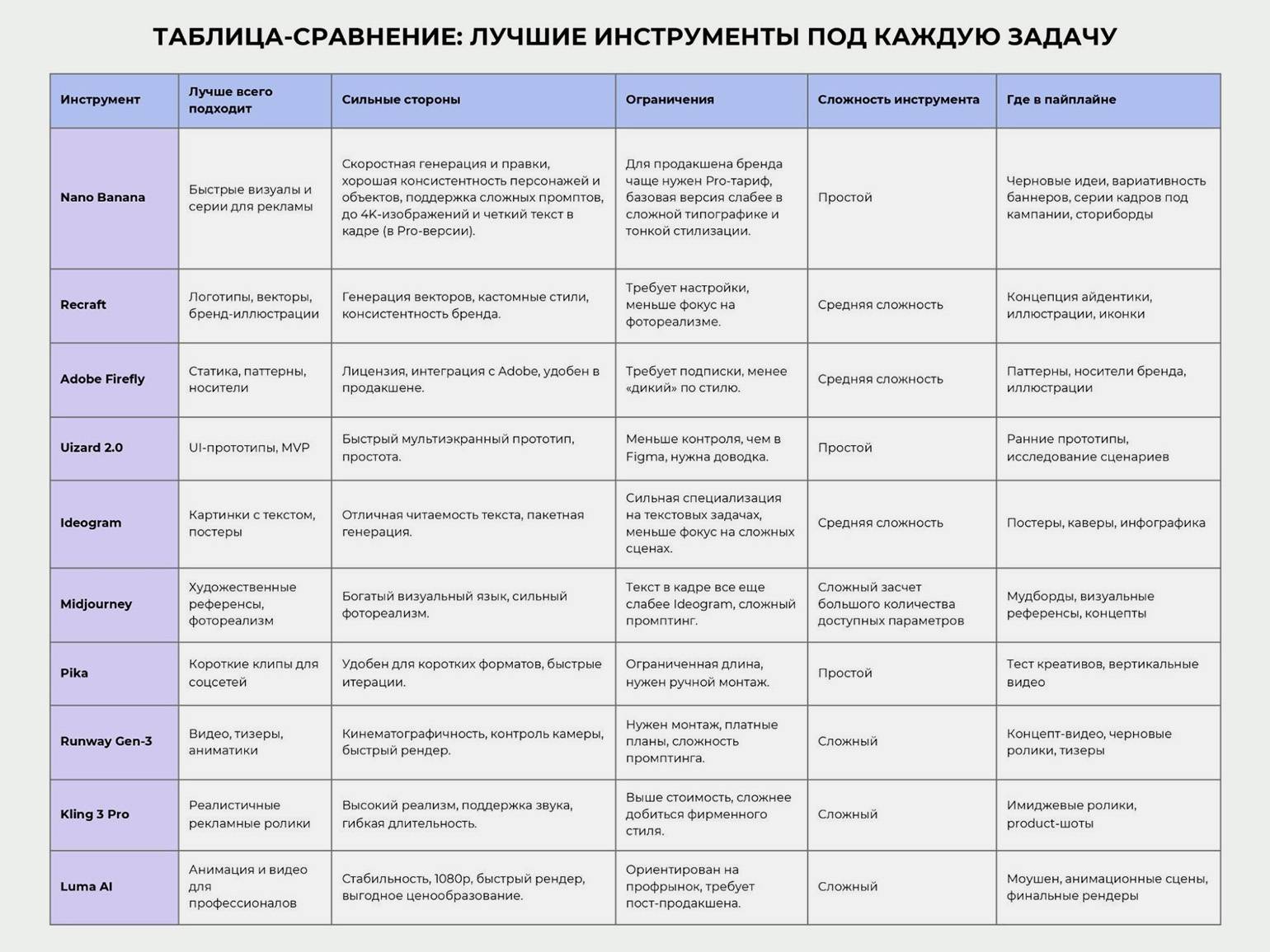 Оптимальная стратегия — собрать рабочую связку из 1–2 инструментов под каждое направление: один — для генерации идей, второй — для доводки до продакшена. Так вы сохраните контроль над стилем и качеством, но при этом не будете тратить недели на то, что сегодня делается за часы.