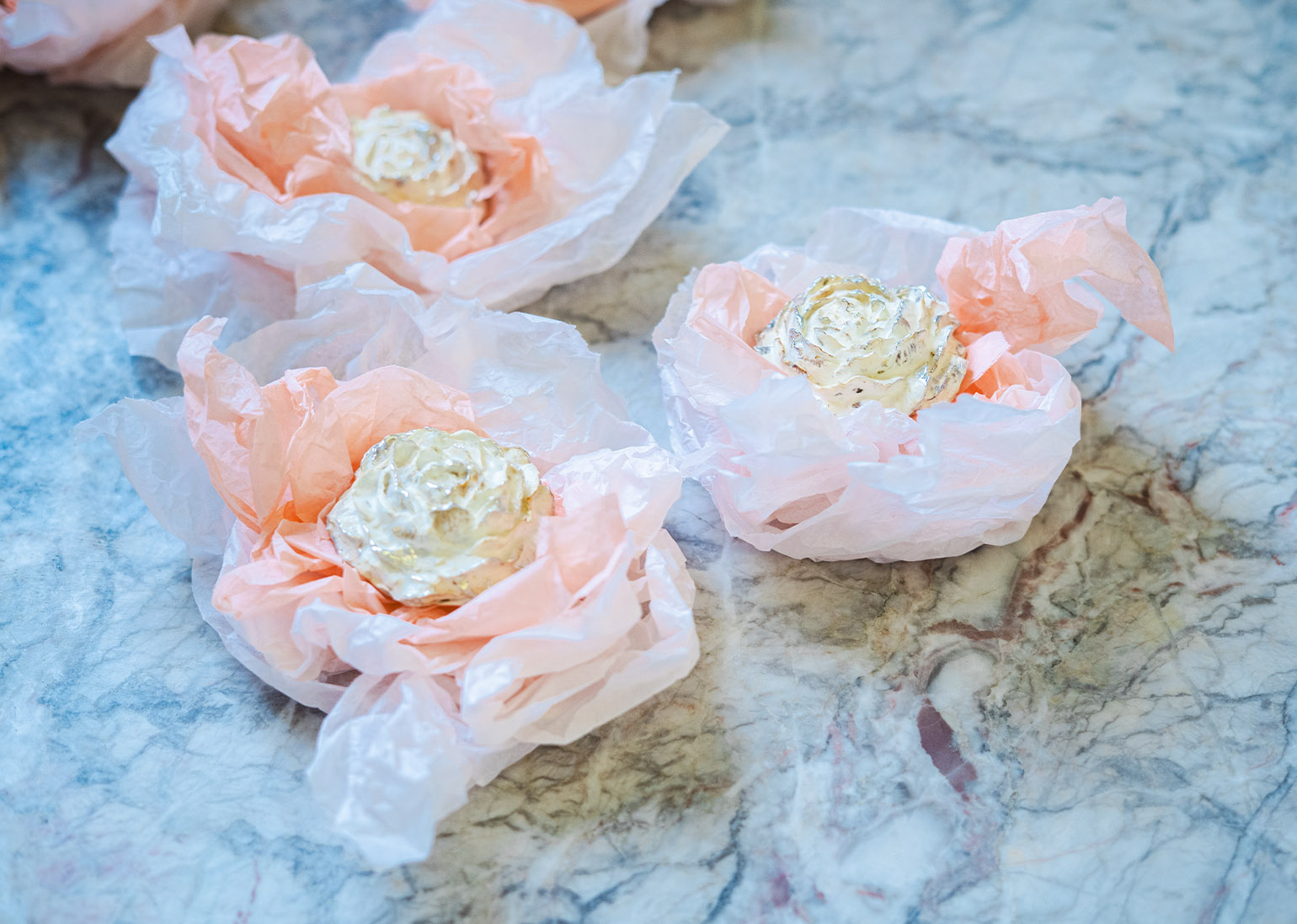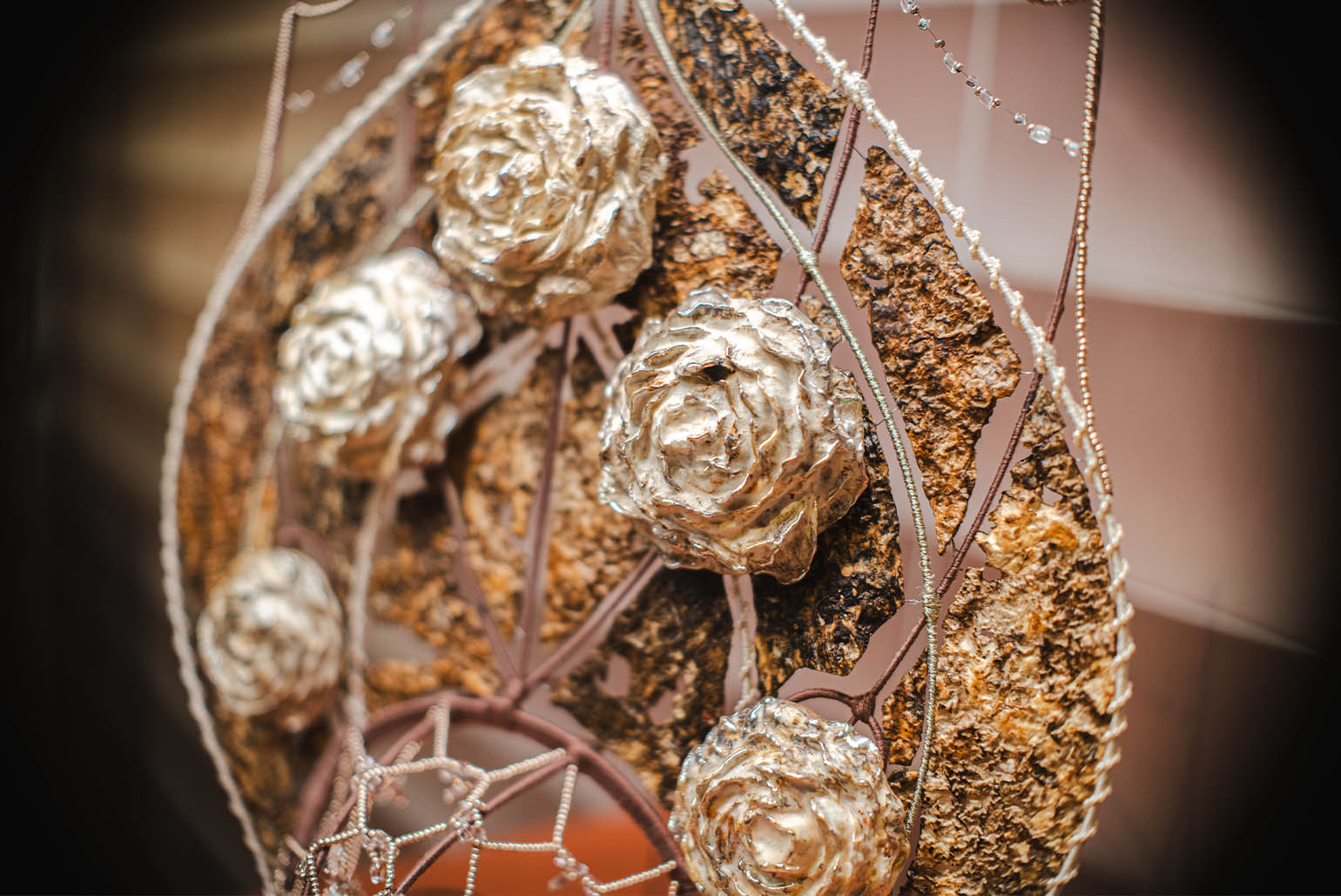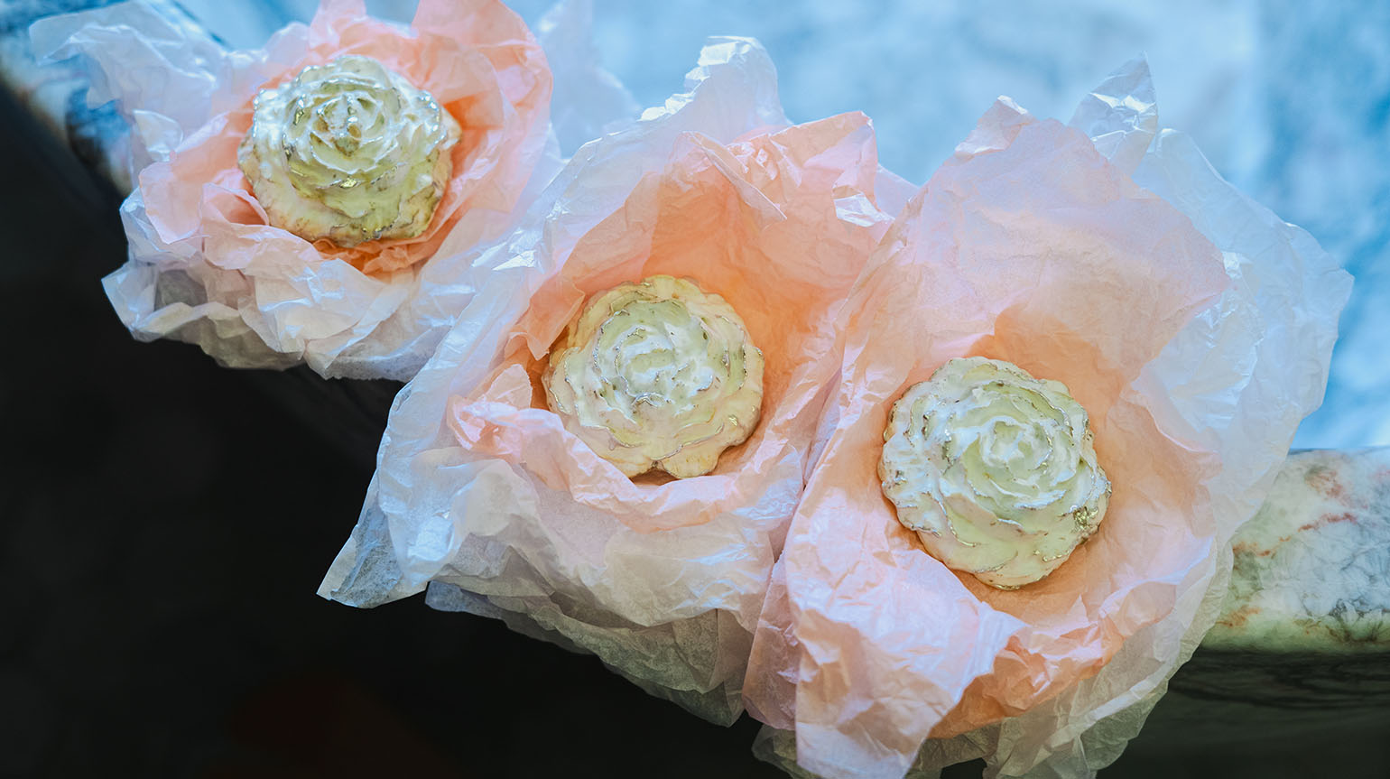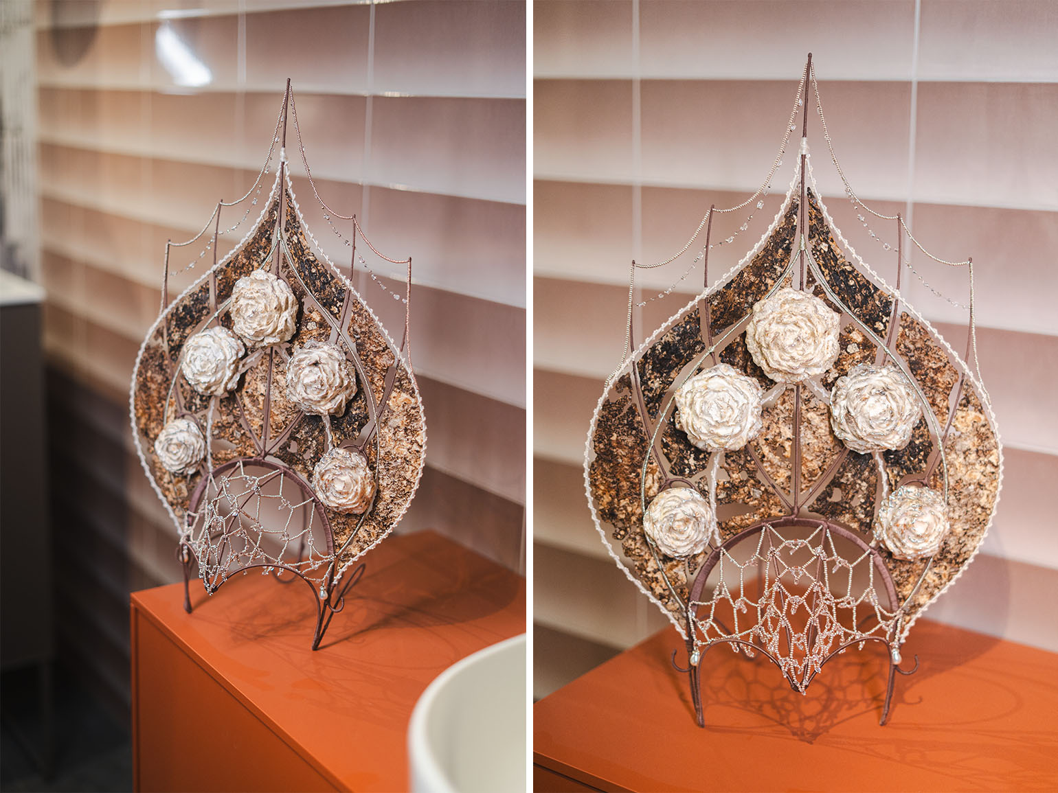 Дополняют композицию декоративные элементы — броши в форме роз, также выращенные из мицелия. Каждая из них имеет индивидуальный природный рисунок и мягкую бархатистую текстуру. В отличие от живых цветов, такие объекты сохраняют форму, подчёркивая идею «законсервированной природы».