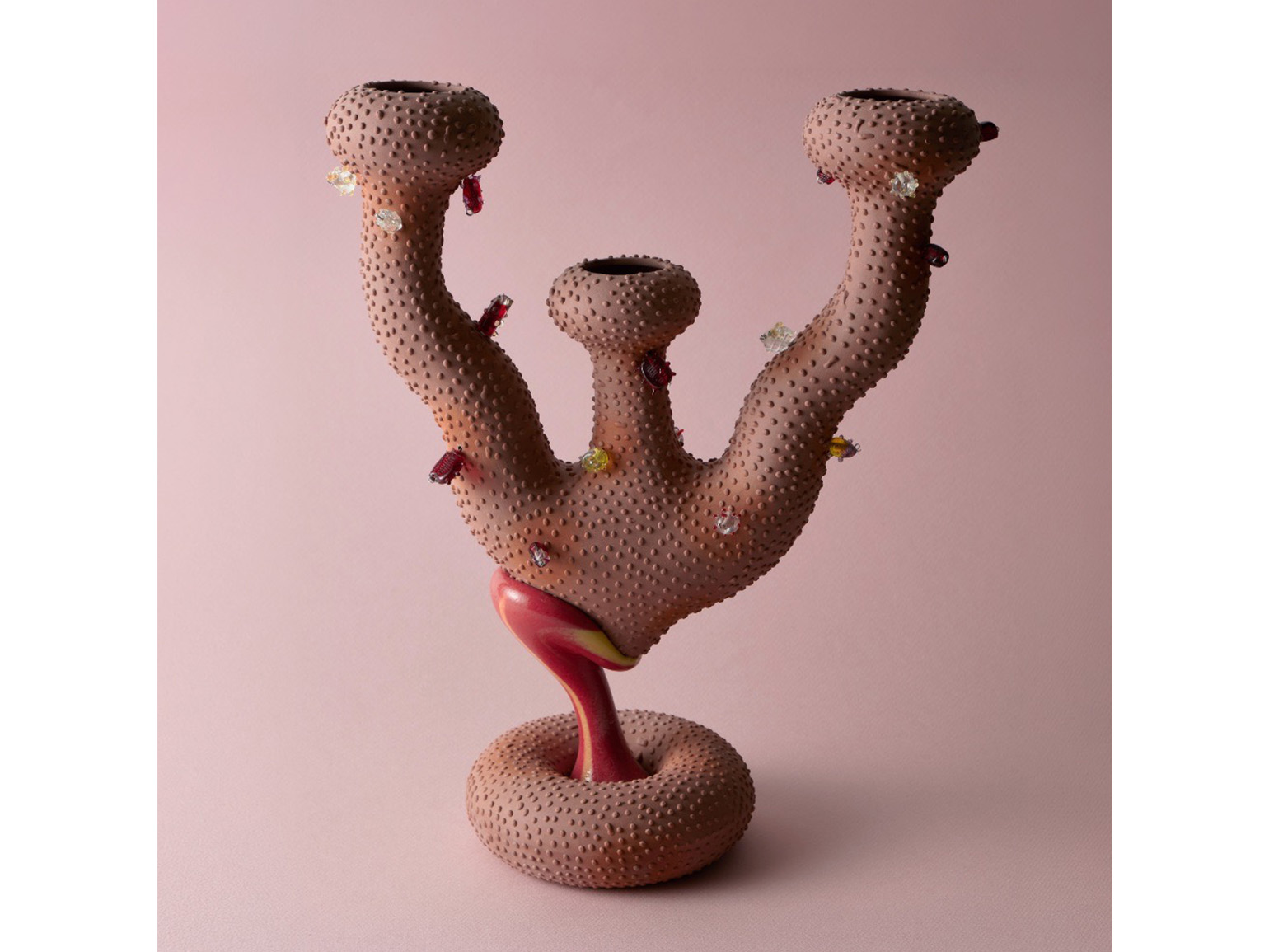 Новые объекты отличаются разнообразием фактур и приёмов. В ряде работ дизайнер использует slip trailer для нанесения рельефных точек, напоминающих пятна на мухоморах. В других — технику lampworking, добавляя цветные стеклянные бусины, или аэрографию для создания градиентных переходов цвета. Каждый предмет сохраняет функциональность — это сосуды для соли, переосмысленные как художественные объекты.