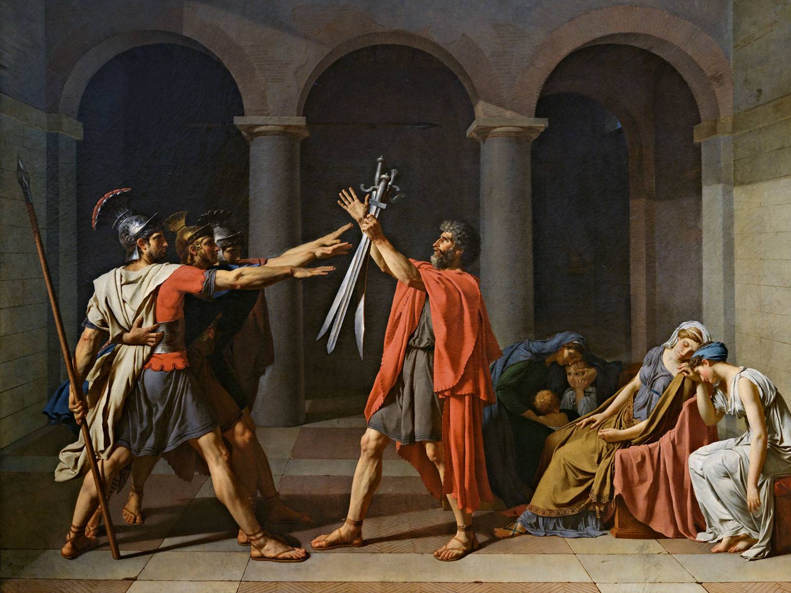 Жак-Луи Давид становится главным светочем Французской революции, начавшейся со штурма Бастилии. Его «Клятва Горациев» (1784) — это манифест античной добродетели против роскоши аристократов. Ничего лишнего: строгая композиция, чёткие линии, никаких барочных завитушек.