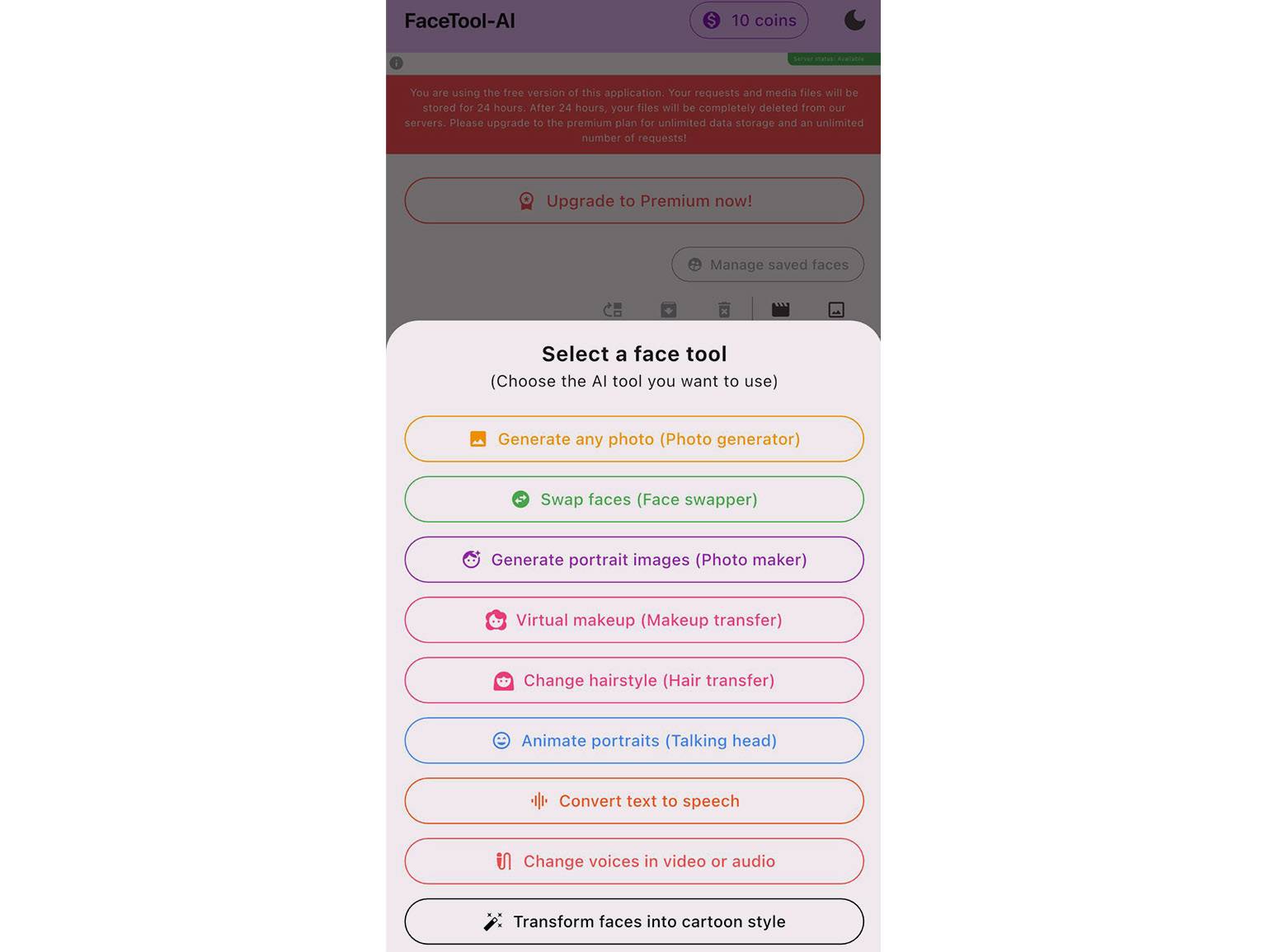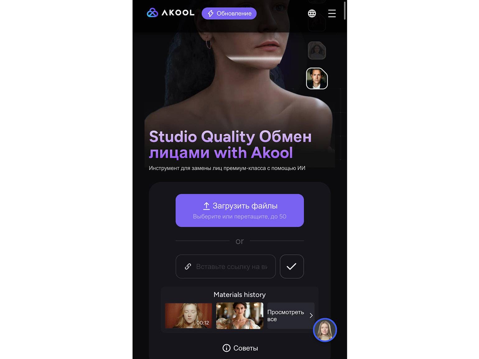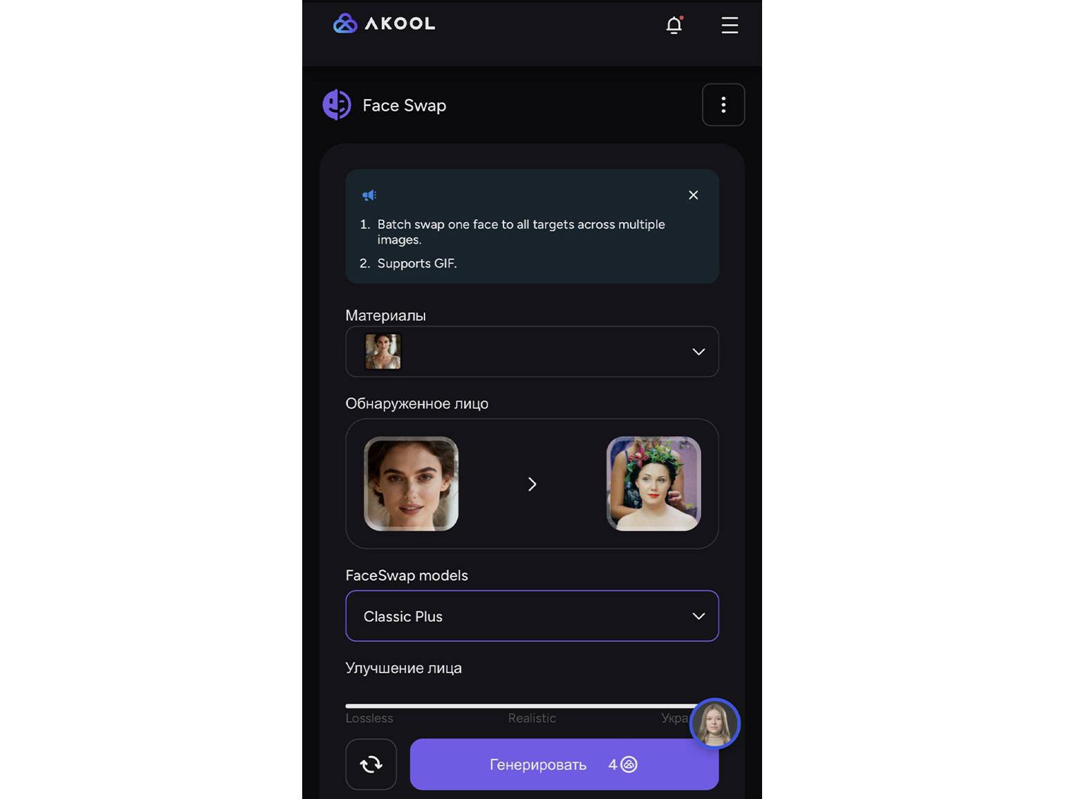 FaceTool — доступное на территории России приложение для Android и iOS. В нём есть функция Swap faces, которая позволяет за несколько кликов заменить лицо в фото и видео. При обработке есть несколько простых настроек, например возможность улучшить лицо. Обработка одного видео стоит 20 кредитов. 1000 кредитов можно купить за 199 рублей.
