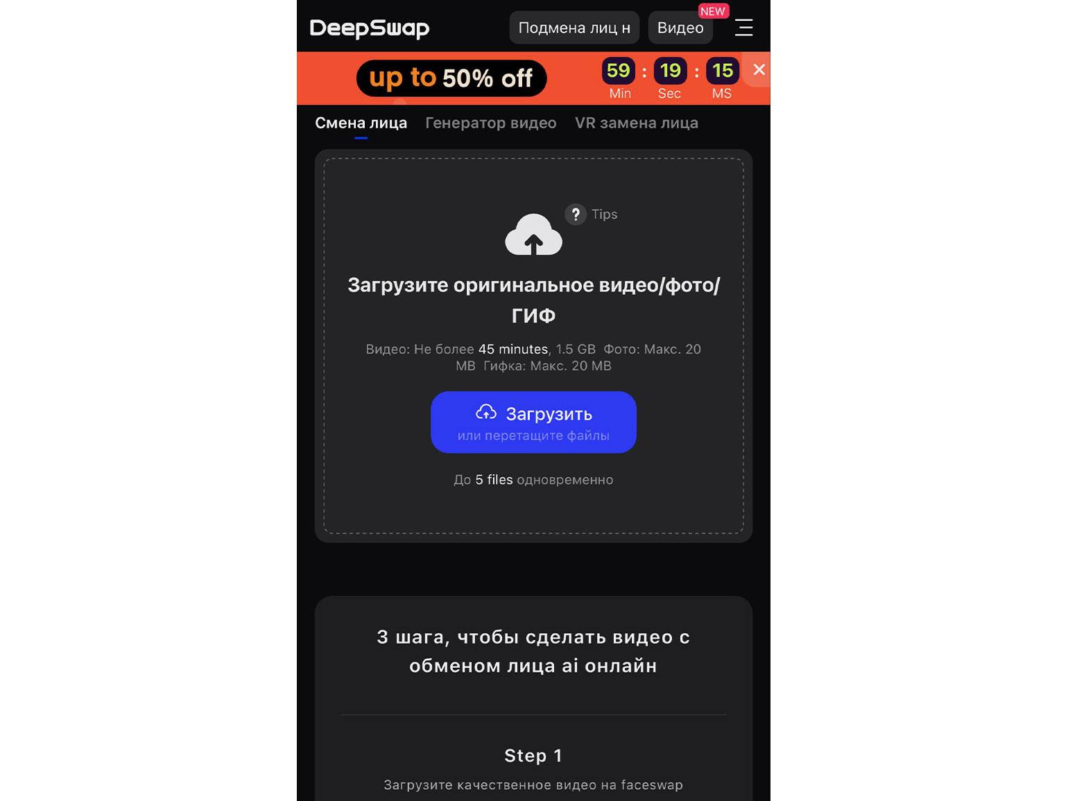 DeepSwap — онлайн-сервис для качественной замены лица на фото, видео и GIF. Благодаря высокой точности распознавания даёт хороший результат даже при сложных ракурсах и в длинных роликах. Замена лица на фото стоит 0,1 кредита, на видео до 15 секунд и GIF — 1 кредит. 20 кредитов можно купить за 9,99 доллара.