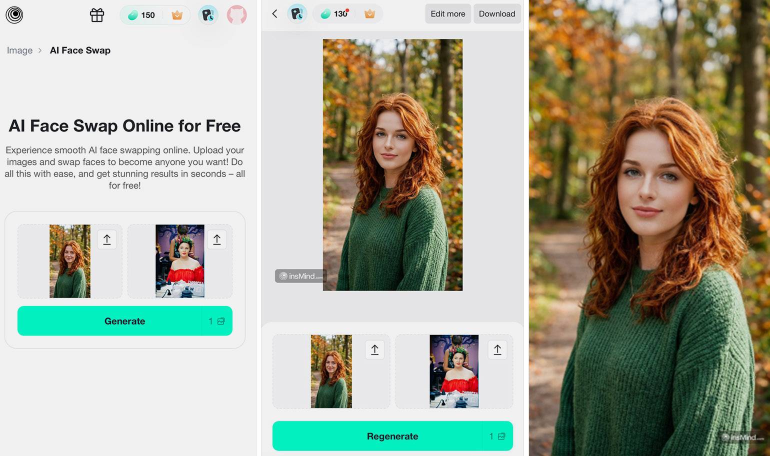 InsMind — простой инструмент для быстрой замены лица на фото. В сервисе нет тонких настроек, вся работа происходит за несколько кликов. Также позволяет превратить женскую фотографию в мужскую и наоборот.