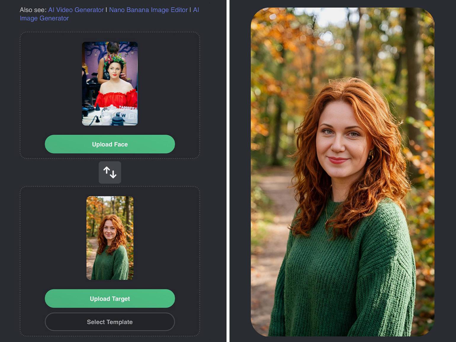 Vidnoz — частично бесплатный онлайн-сервис, в котором можно изменить лица на фото и видео за пару кликов. Создаёт достаточно естественный результат благодаря анализу ориентиров лица, подбору освещения, оттенка и текстуры кожи. Здесь нет сложных настроек, а интерфейс достаточно минималистичный, поэтому сервис отлично подходит для новичков.