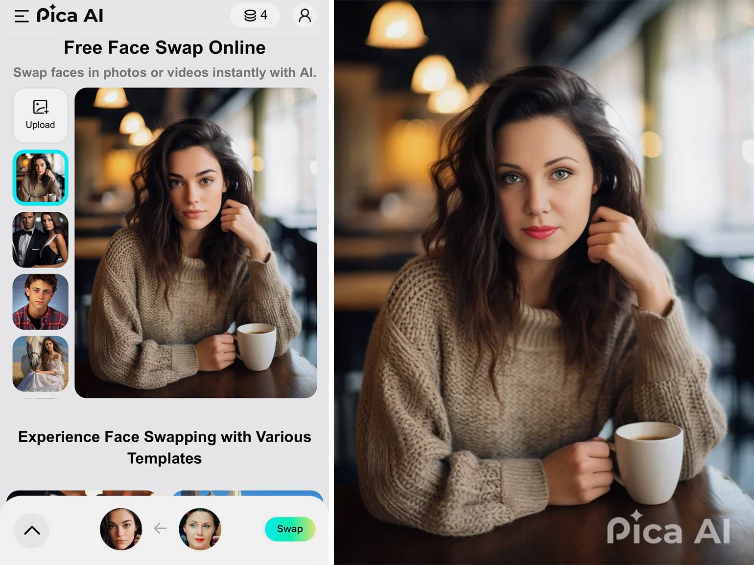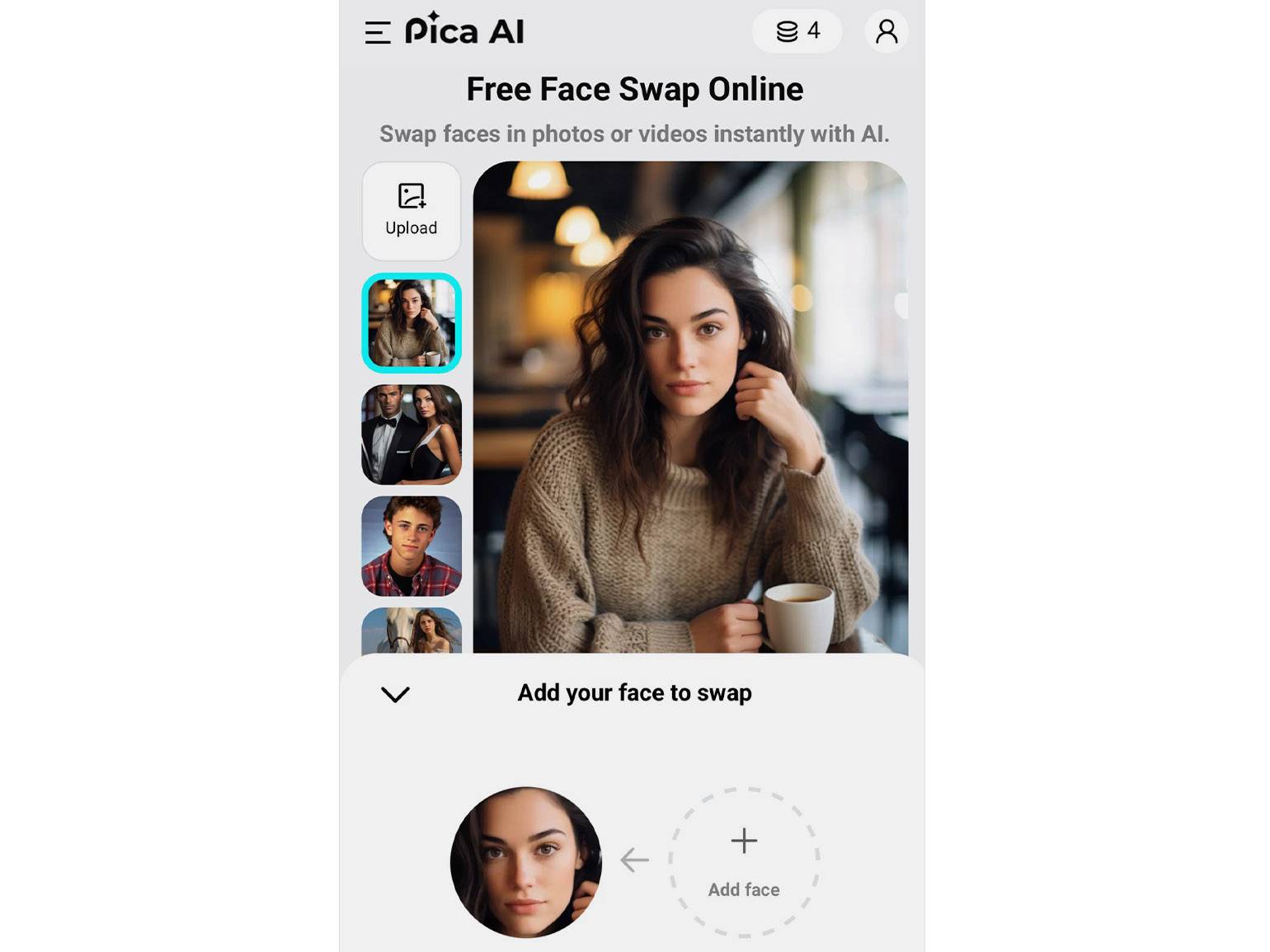 Pica AI — простой онлайн-сервис для замены лица на фото и видео. Можно загрузить своё изображение, а можно выбрать из предложенных и вставить в него другое лицо. Замена происходит в три клика и занимает около минуты, регистрироваться не обязательно. Платные подписки начинаются от 9,99 доллара в месяц. Инструмент простой и хорошо подойдёт тем, кто только начинает работать со сменой лиц.