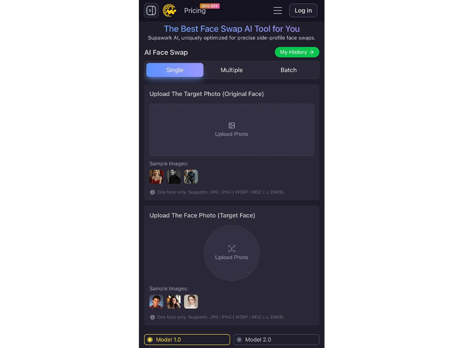 Онлайн-сервис Supawork AI позволяет менять лица на фото, видео и GIF. Бесплатная версия идеально подходит для новичков, чтобы попробовать работу с разными типами файлов.