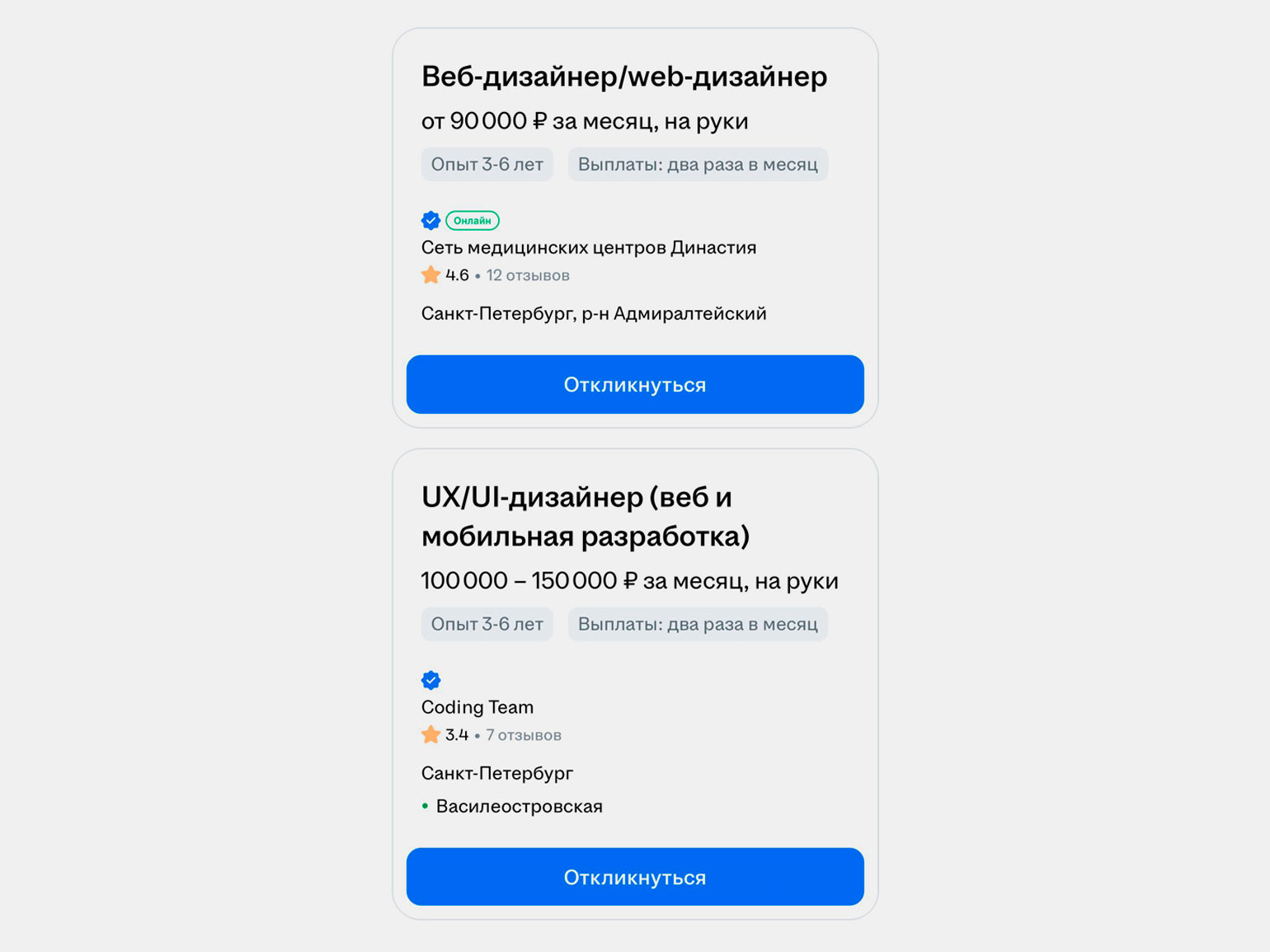 В Санкт-Петербурге вилка чуть ниже: 80 000–125 000 для middle-дизайнеров и 90 000–150 000 для senior-дизайнеров.