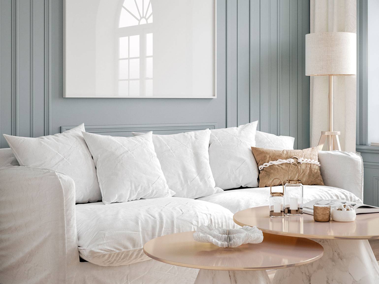 Важная деталь такого интерьера — текстиль. Плотный, благородный, фактурный, насыщенных или пастельных оттенков. Подойдут плотный хлопок, лён, шёлк, бархат.