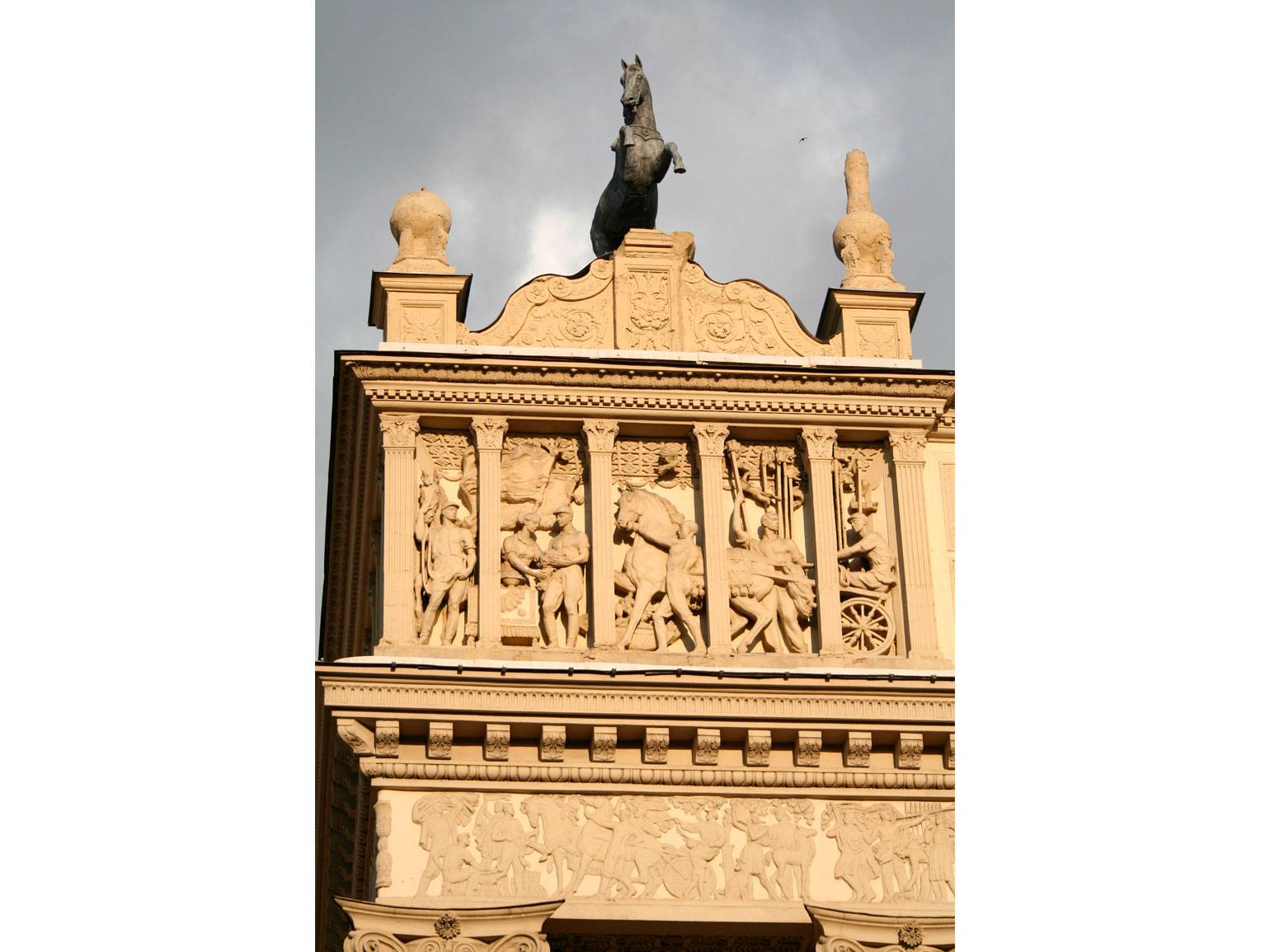 Фактически здание пришлось отстраивать заново: вместо двух прежних башен оставили одну. А справа поместили восьмиколонный портик коринфского ордера. Четыре уцелевшие при пожаре конные статуи разместили на фасаде, украшенном лепными барельефами.