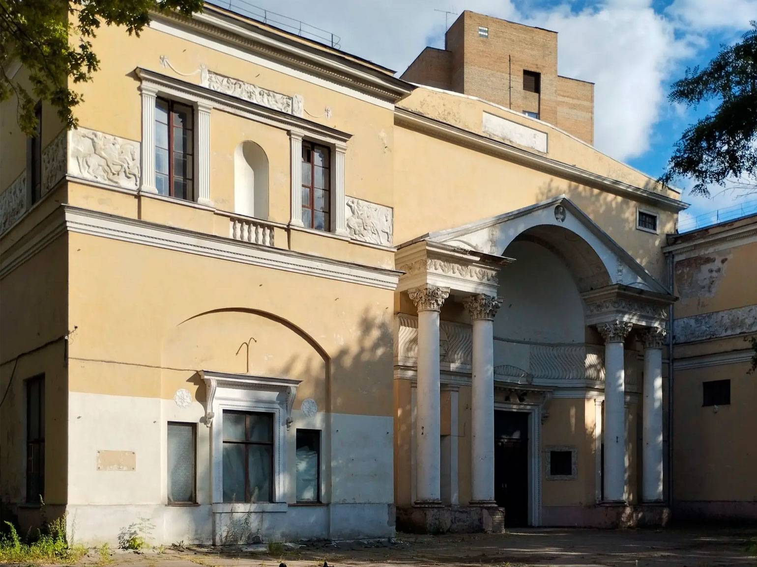 Ранний неоклассицизм России 1900-х воплощался в особняках и резиденциях. Его целью было повысить престиж императорской власти. Одно из первых зданий в этом стиле — Дом Скакового общества в Москве по проекту И. В. Жолтовского. Парадный вход оформлен колоннами коринфского ордера. Фасад декорирован лепными фризами с античными сюжетами: преимущественно изображениями скачущих всадников.