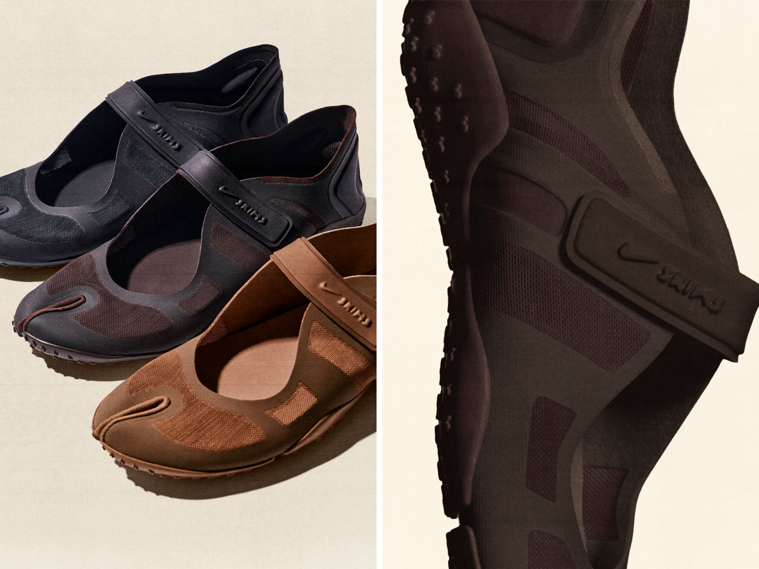 В версии NikeSkims Rift сохранили ключевую особенность силуэта, но дизайн стал более минималистичным и адаптированным под эстетику Skims. У модели один ремешок на подъёме, облегчённая подошва с отсылкой к концепции «бега босиком», а также сдержанный текстурированный логотип.