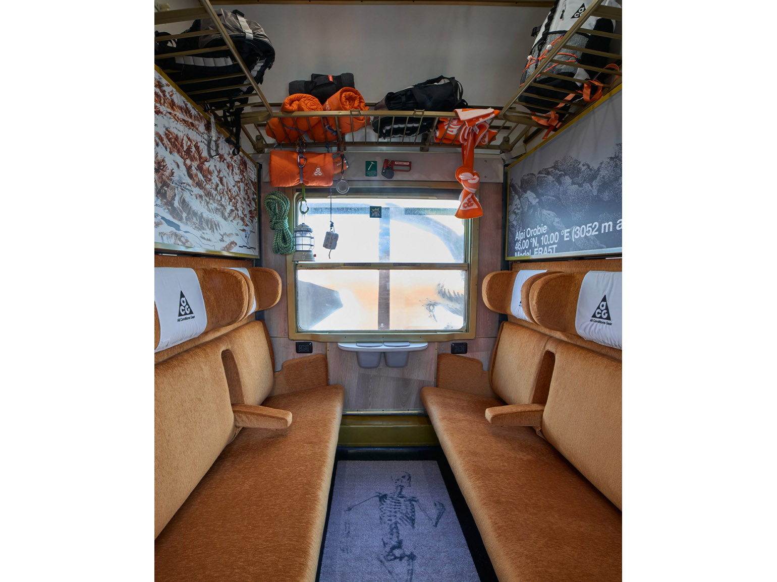Поезд оформили в фирменном ярко-оранжевом цвете ACG. Он буквально насыщен айдентикой бренда. Треугольный логотип, впервые показанный в 1988 году, разместили повсюду — от обивки сидений до мелких деталей интерьера. При этом привычный Nike Swoosh в оформлении практически отсутствует: компания намеренно подчеркнула автономность и характер ACG как отдельного направления, ориентированного на аутдор.