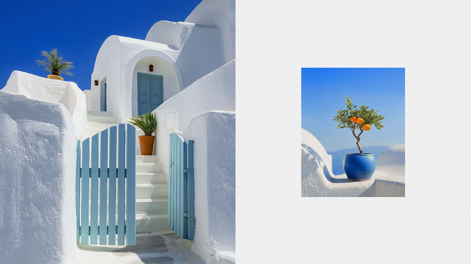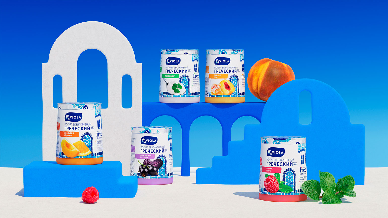В оформлении использовали узнаваемые мотивы архитектуры и пейзажей Греции — улочки, лазурные ставни, двери, сине-голубую мозаику. В центре композиции поместили домик Viola, который напоминает о видах в Санторини.