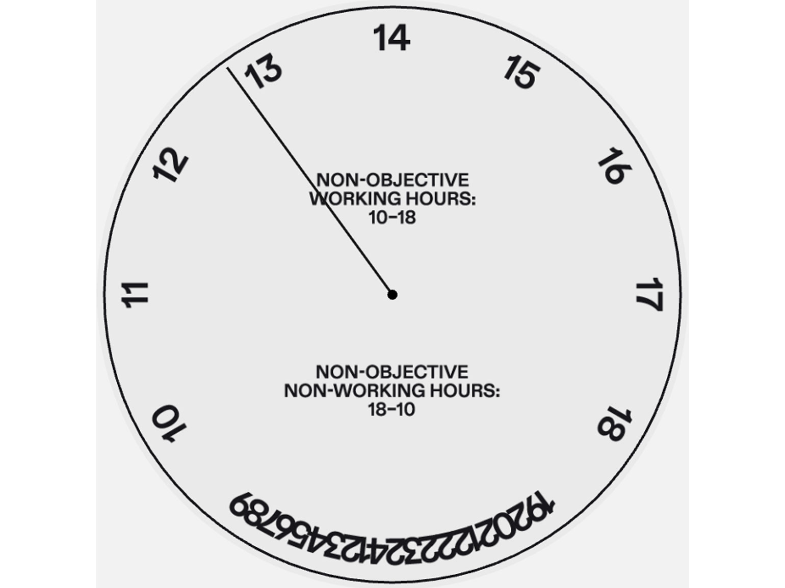Артём Матюшкин: В каком-то смысле мы используем образ измерителя рутины, чтобы выйти из рутины. У нас один из первых циферблатов как раз про часы работы Non-Objective. Он, конечно, старый. Он про то, что рабочие часы тянутся будто бы долго, а всё, что между ними, схлопывается.
