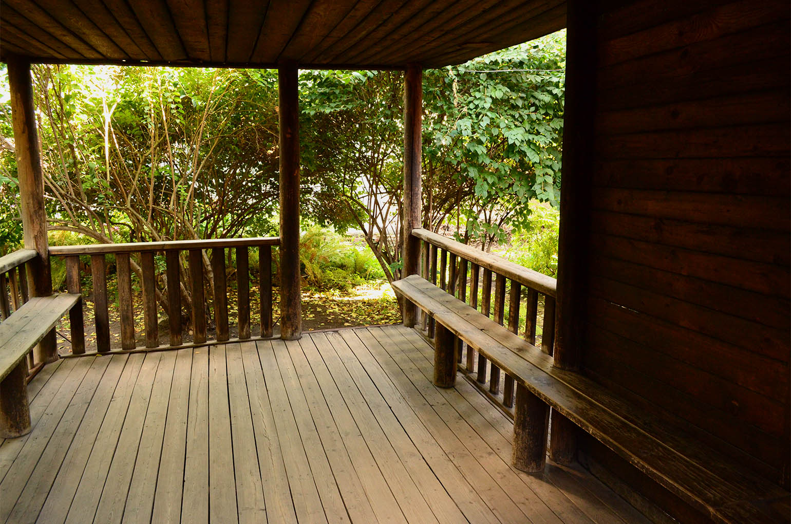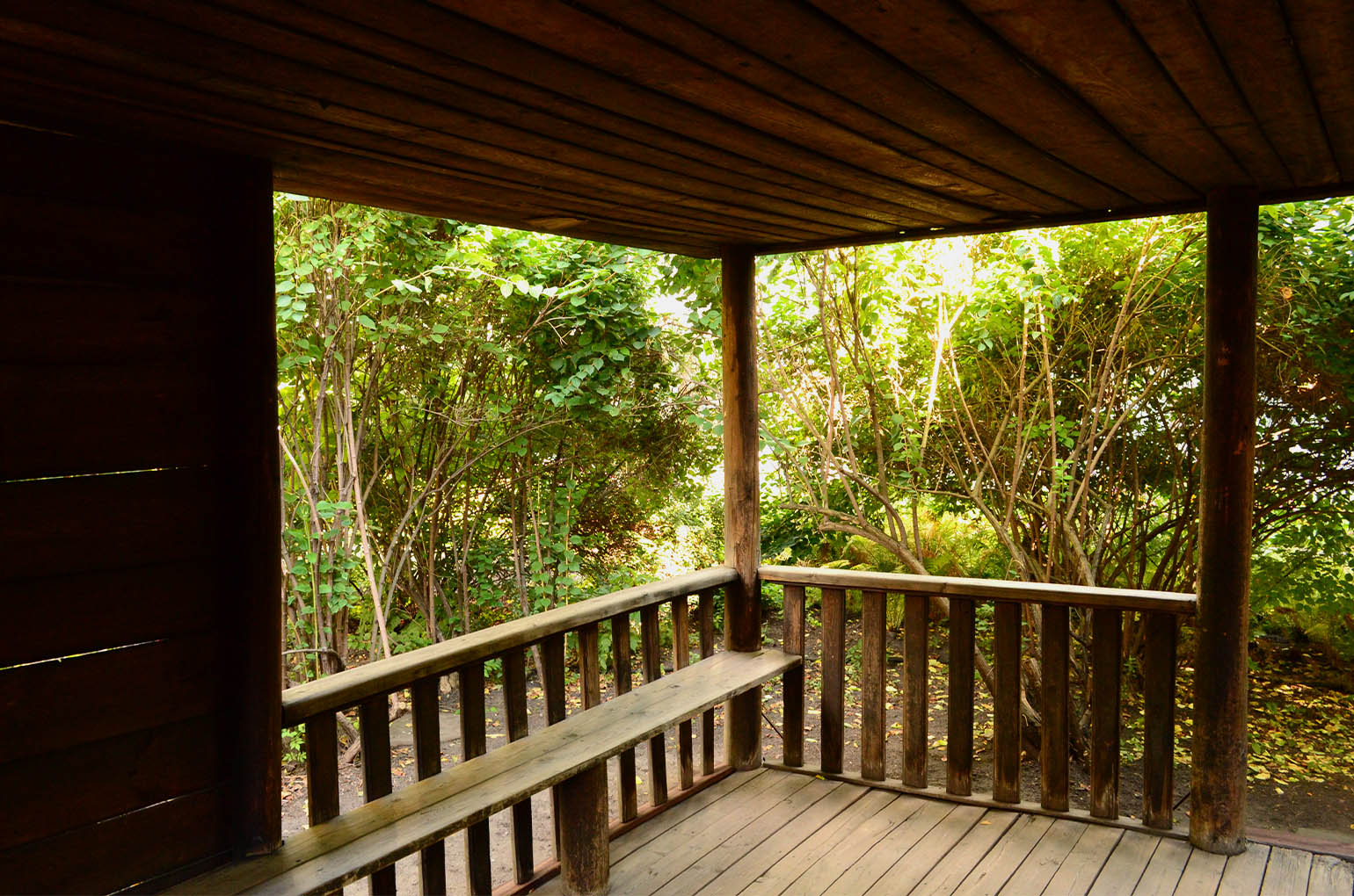 За террасой — сад: густая, потемневшая от влаги зелень, тяжёлые ветви слегка наклонены. В глубине угадывается деревянная постройка. Над всем — пасмурное, но уже светлеющее небо. И ни одного человека — только след его присутствия.