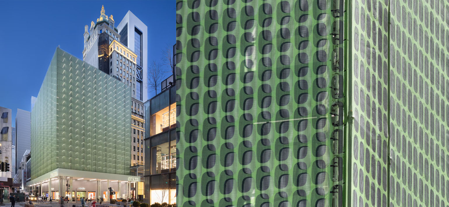 Проект покрывает две фасадные стороны здания и построен из стандартных металлических лесов, окрашенных в фирменный зелёный цвет Prada. Поверх конструкции натянут полупрозрачный материал — scrim (лёгкая ткань на бумажной основе, которую часто используют в театральных декорациях). Его уложили в два слоя и напечатали на них разные узоры, чтобы добиться эффекта муара — визуальной ряби, меняющейся при движении и изменении освещения.