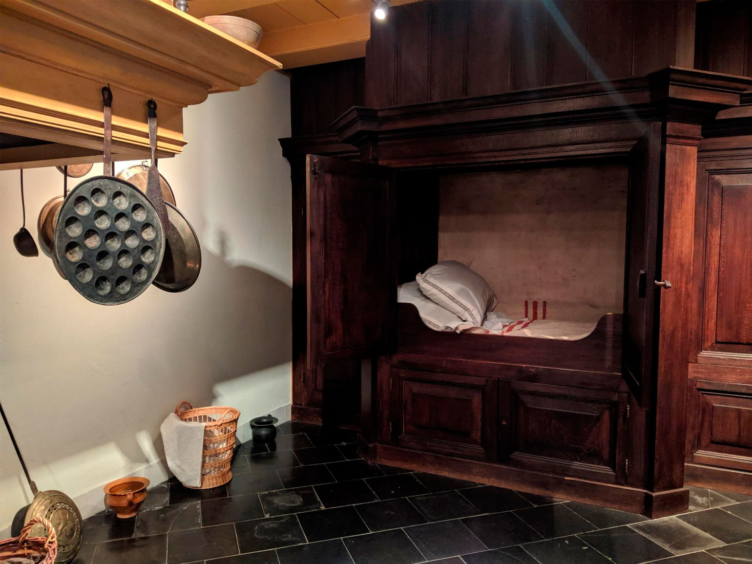 В те времена люди спали полулёжа, и именно такую кровать можно увидеть на кухне рембрандтовского дома: она предназначалась для служанки.