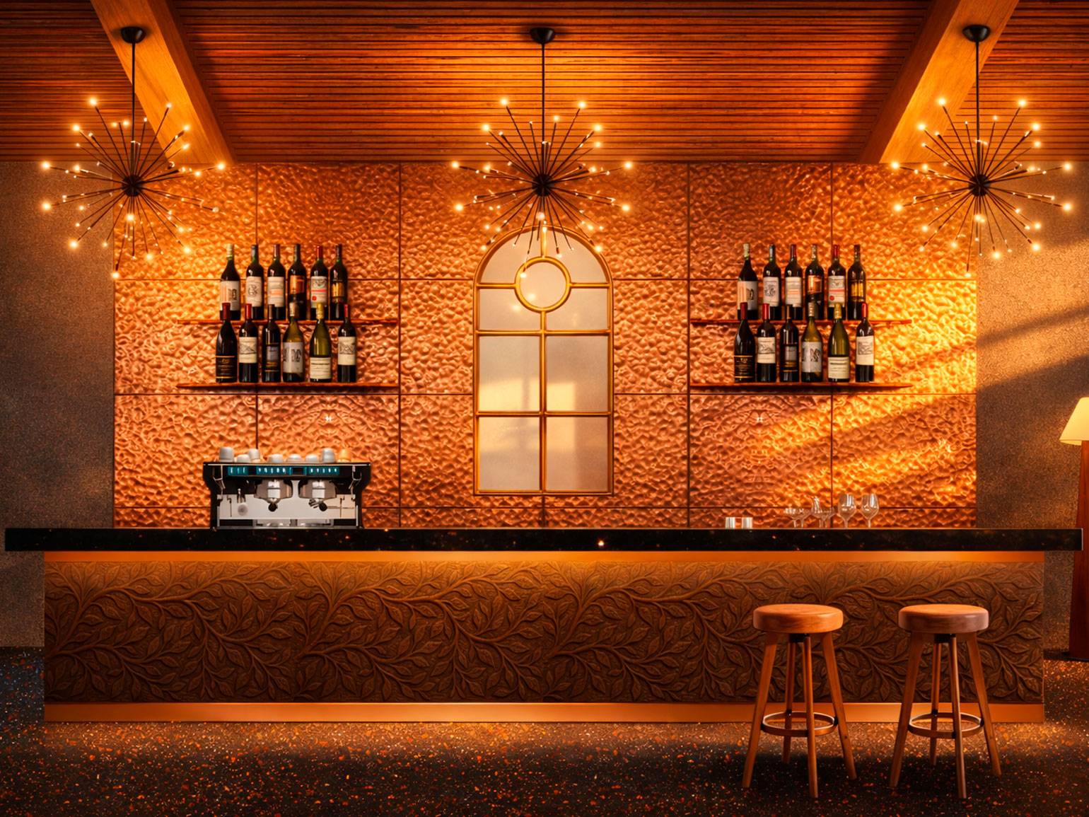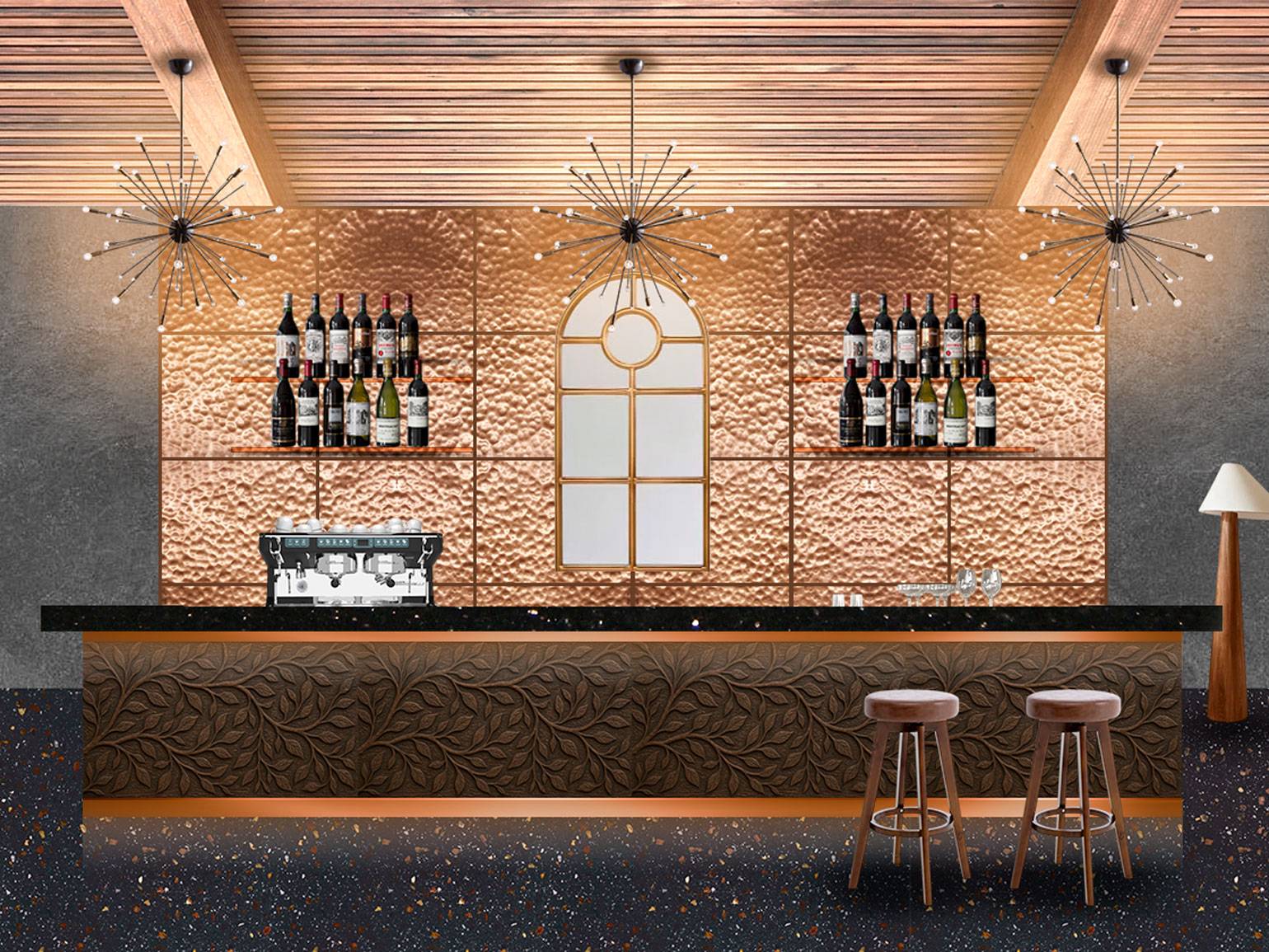 Ещё одним заданием была барная стойка для ресторана «Кокошник» — довольно необычный проект в русском стиле. Представьте: ресторан на окраине леса, с панорамными окнами, выходящими прямо в чащу, а рядом река. Очень интересно!
