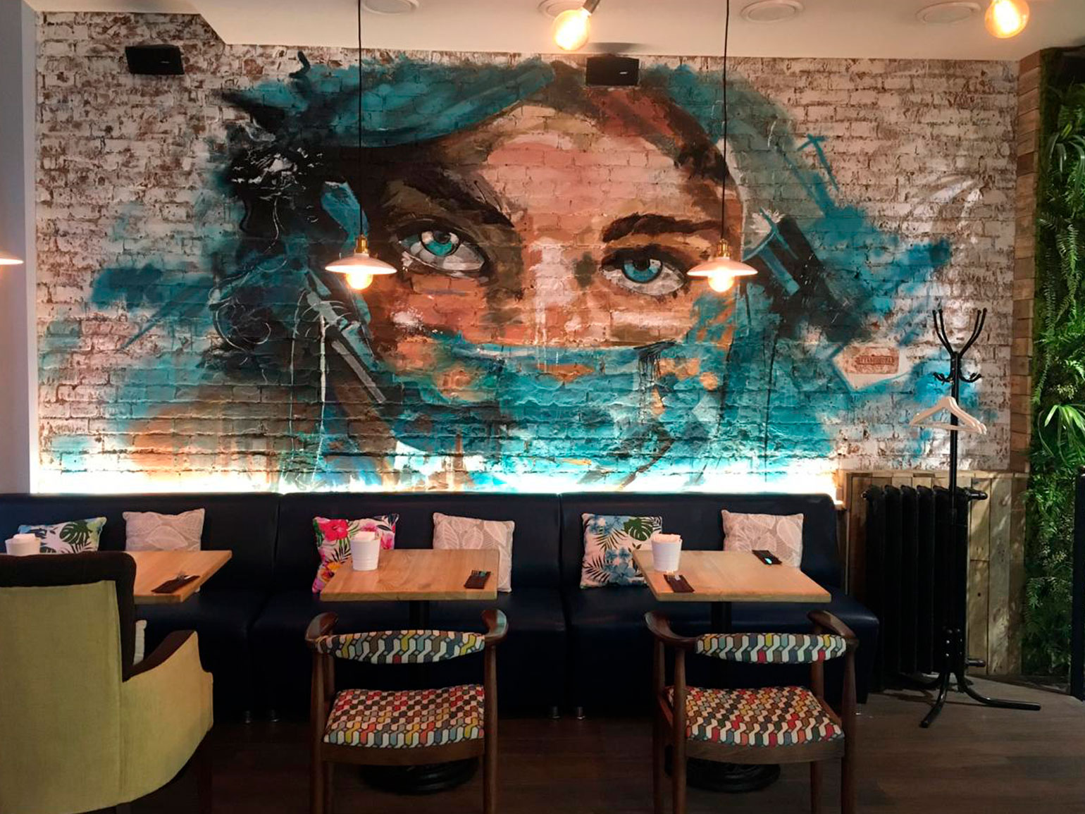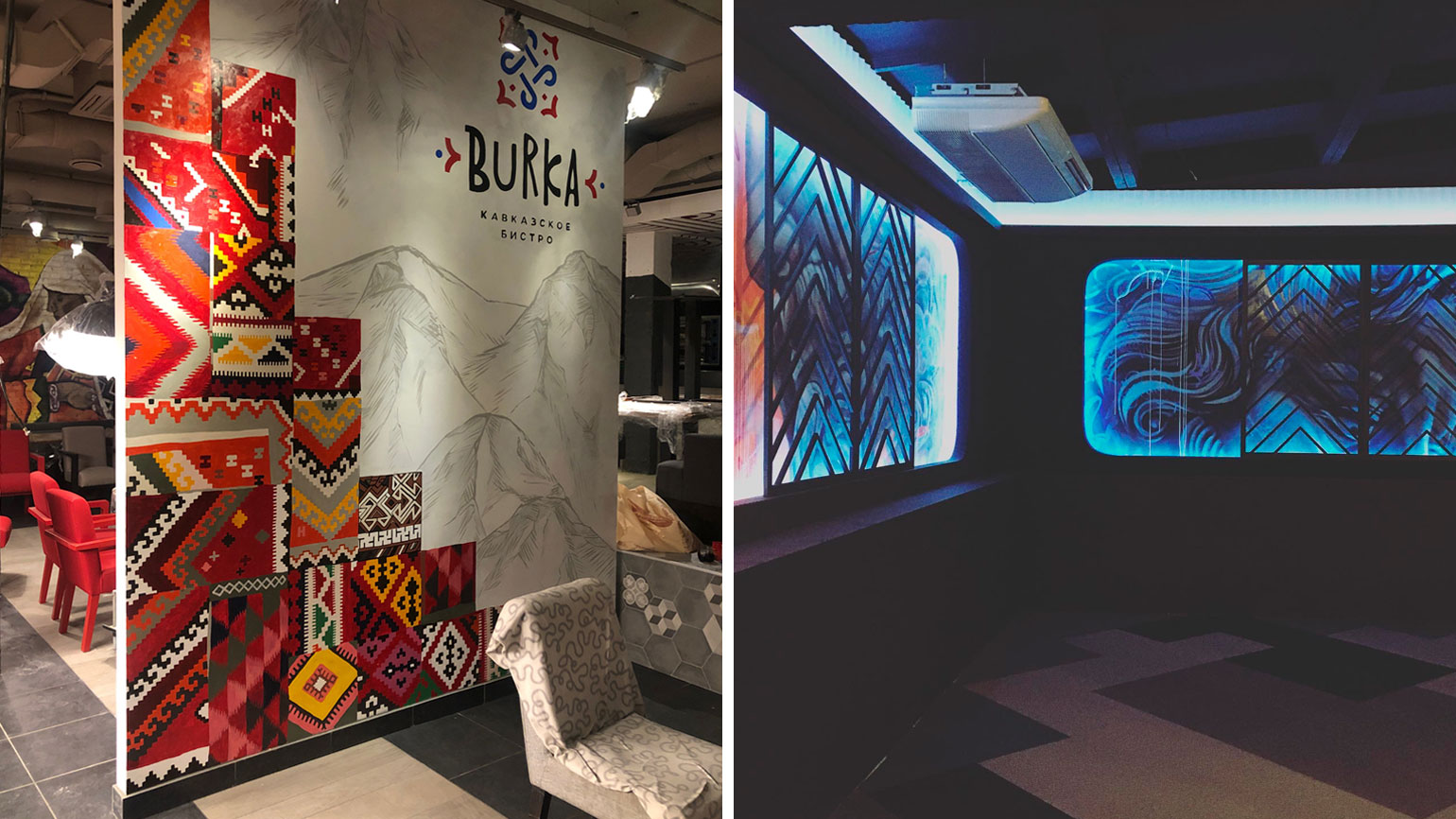 Например, в одном филиале Black Star Burger я расписывал стены под ковры, а ещё я оформлял пространство нескольких ресторанов Novikov Group и занимался воплощением дизайнов разных «Сыроварен» и уютного заведения «Хинкали-Эклеры» в Ростове-на-Дону.