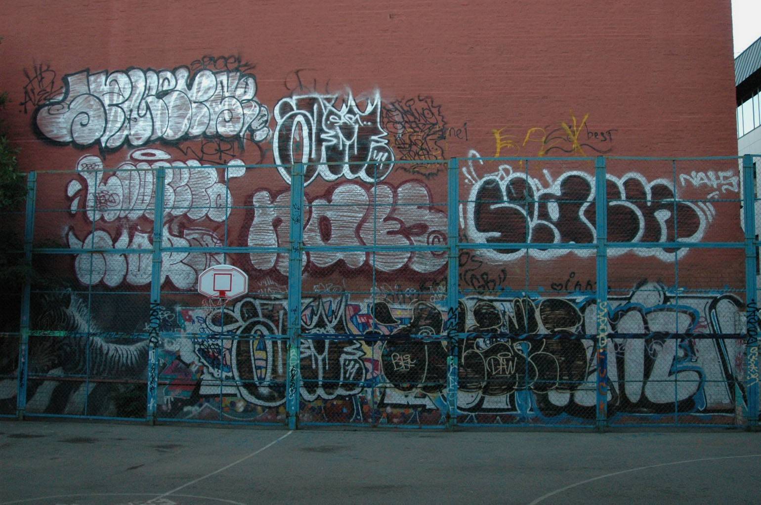 Ghetto-эстетика посреди Патриарших: красная кирпичная стена прямо за футбольным полем, расписанная в пять этажей. Даже зимой среди сугробов площадка выглядит как декорация к фильму про нью-йоркский полукриминальный мир.