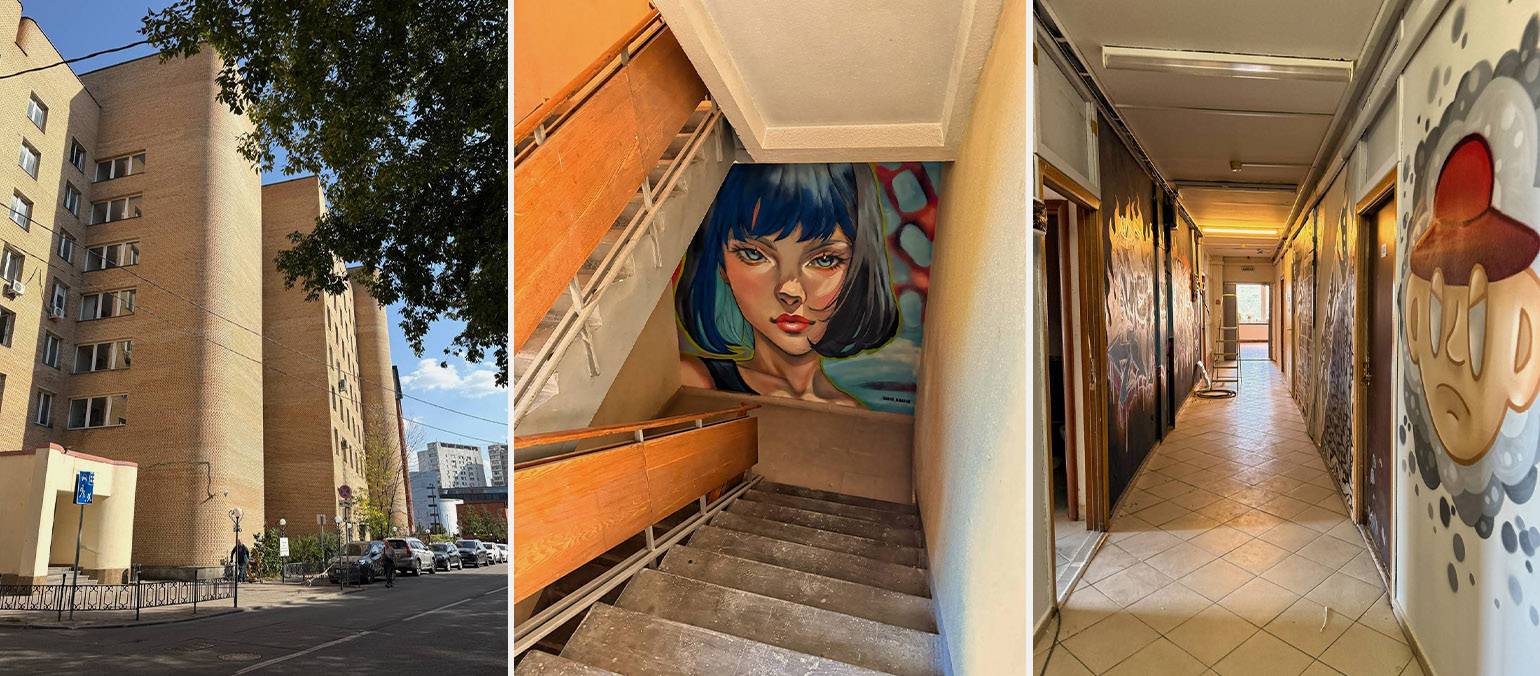 Бывшая гостиница 1976 года постройки превратилась в многоэтажный лабиринт с граффити. Сейчас, осенью 2025-го, здесь вовсю идёт ремонт, но вход свободный. Каждый этаж — новая серия рисунков: краска перетекает в лифтовые шахты и вентиляцию, а поблизости ни одного охранника.