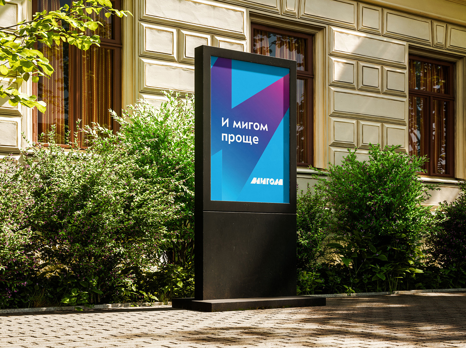 Название «Мигом» отражает цель платформы — сделать привычные процессы быстрее и проще. Логотип — строгая динамичная надпись. Внутри букв заложена метафора передачи данных — направленные друг к другу лучи. Молния указывает на скорость работы, а преломление лучей и градиент подчеркивают разнообразие сценариев использования.