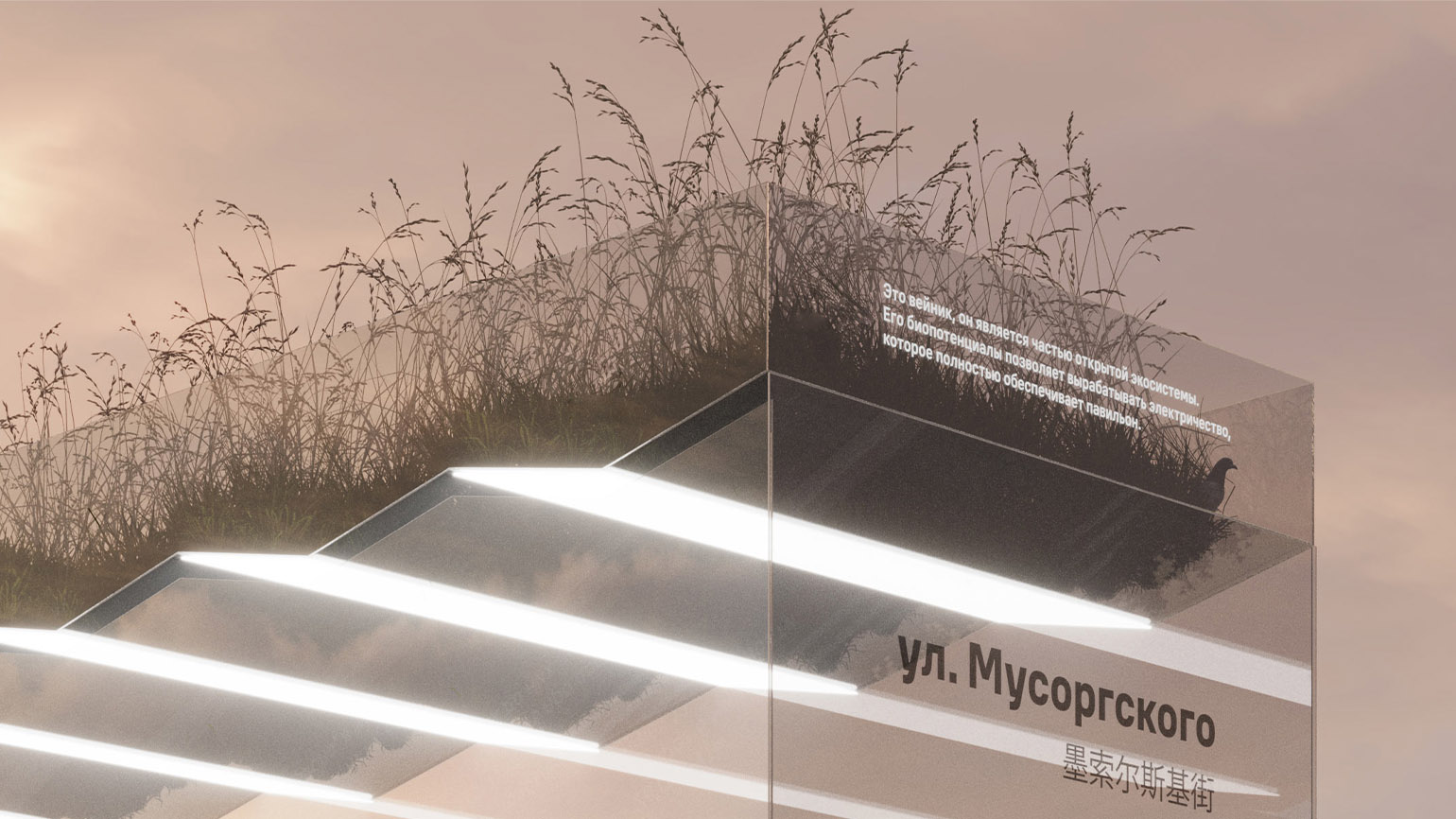 Фасад остановки выполнен в виде единой прозрачной интерактивной панели smart glass. В верхней левой части выводится ключевая информация: дата, погода и время прибытия транспорта. Нижний сегмент отведён под познавательный контент.