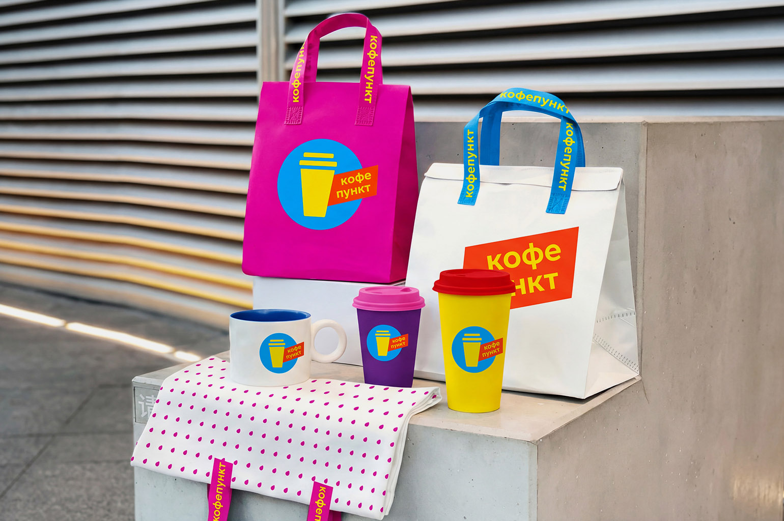 Логотип выполнен в виде синего круга с жёлтым стаканчиком внутри, справа надпись «Кофепункт» в две строчки жёлтыми буквами на красном фоне. Цвета, видимо, выбраны те, что уже ассоциируются с пунктами выдачи маркетплейсов Ozon и «Яндекс Маркет».