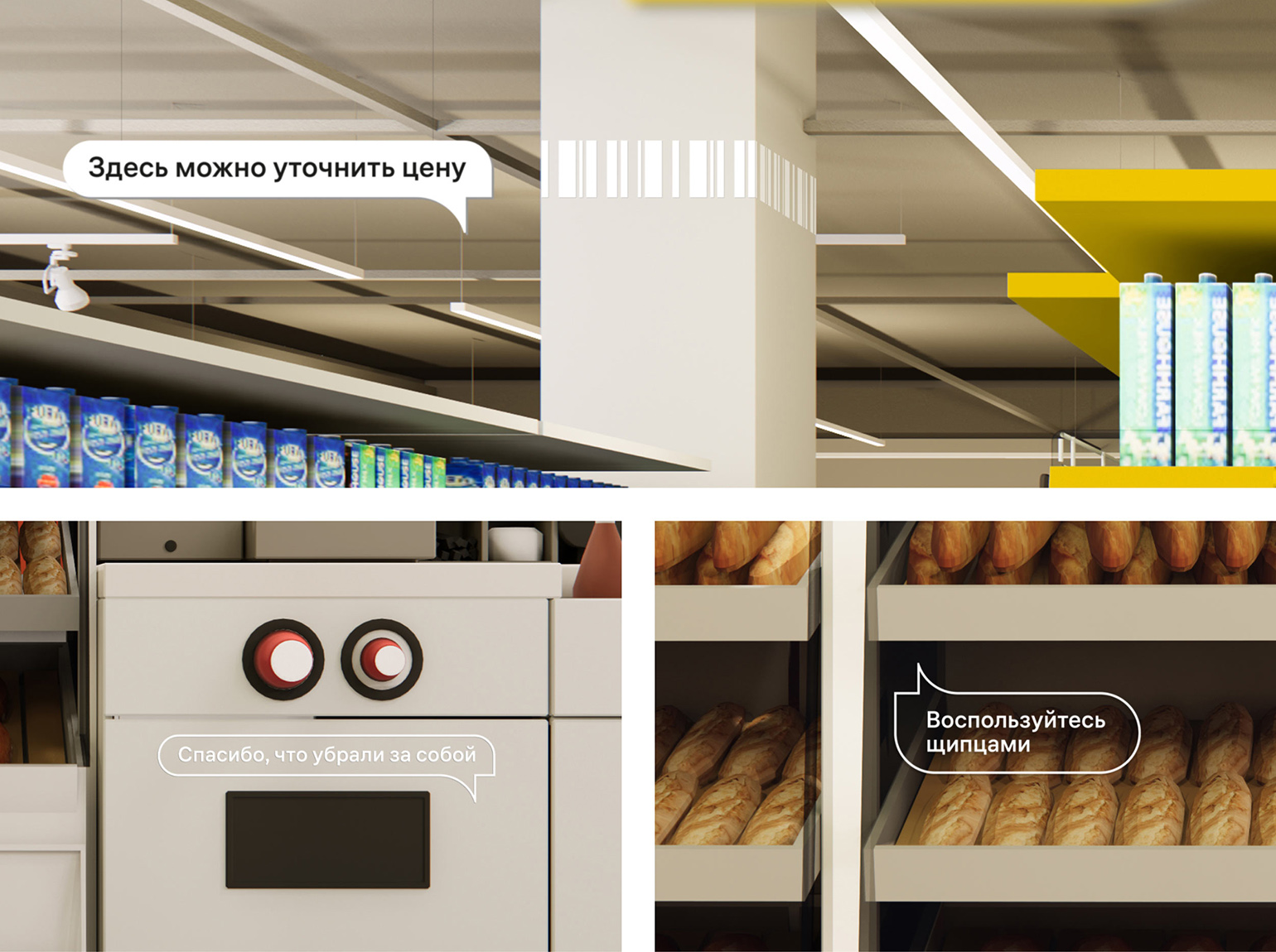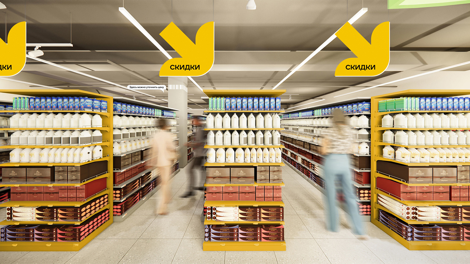 В навигации добавили бабблы с подсказками — они рассказывают о преимуществах сети. Внимание к акциям привлекают подвесы-стрелки и тематические вывески.