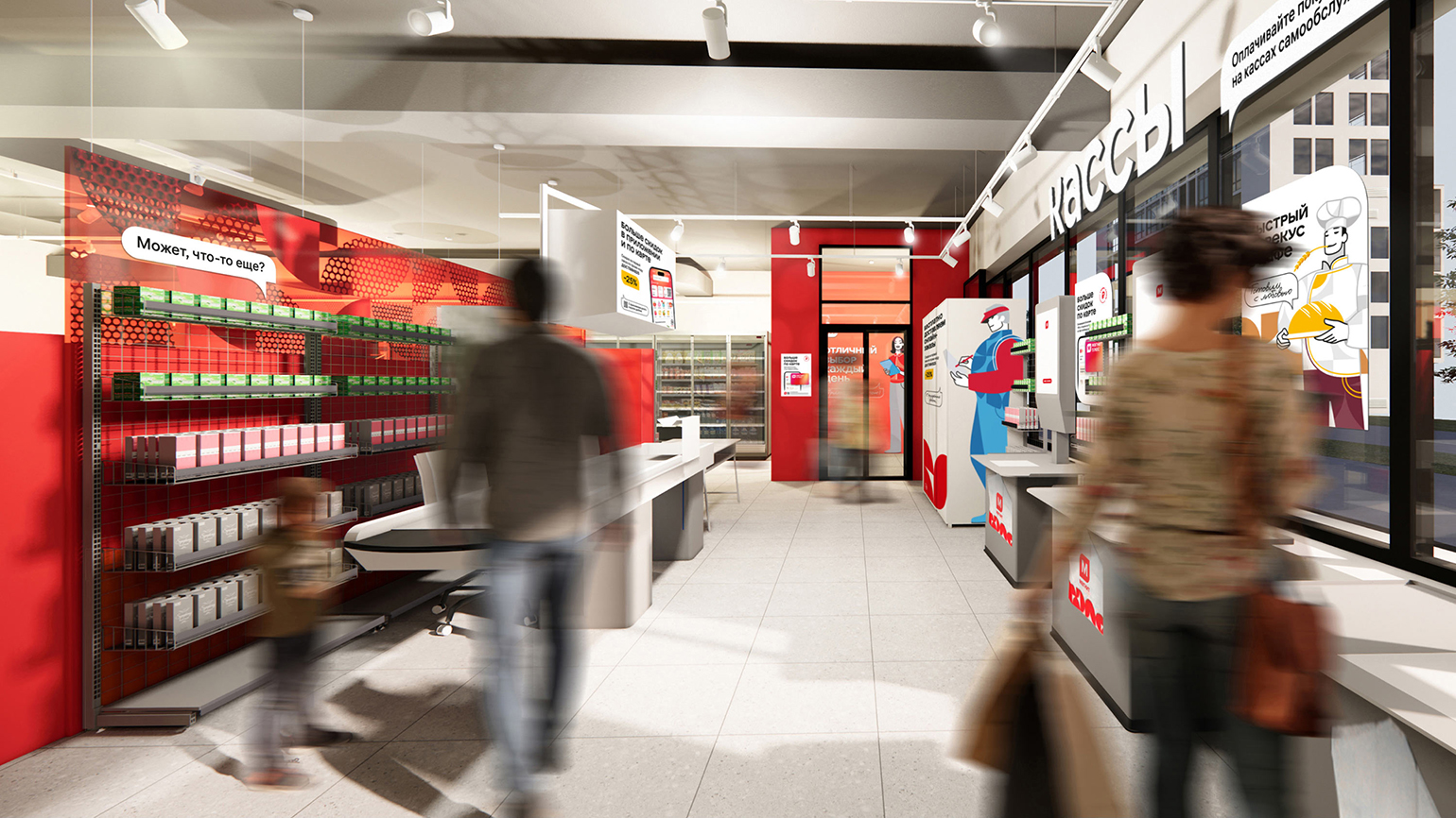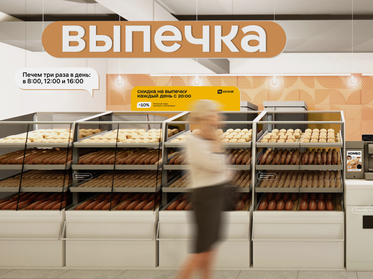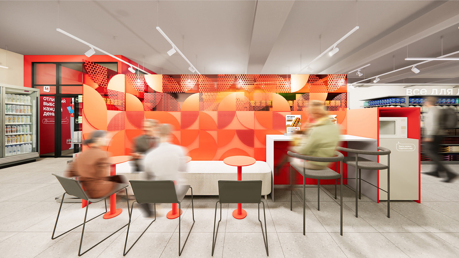 Кроме того, магазинам после реконцепции потребовались новые интерьеры, навигация и собственный визуальный язык общения с покупателями. В студии разработали зонирование, оформили пространства и подобрали мебель. В кафе и пекарнях появились перегородки с фирменным паттерном, которые перекликаются с контурами логотипа.