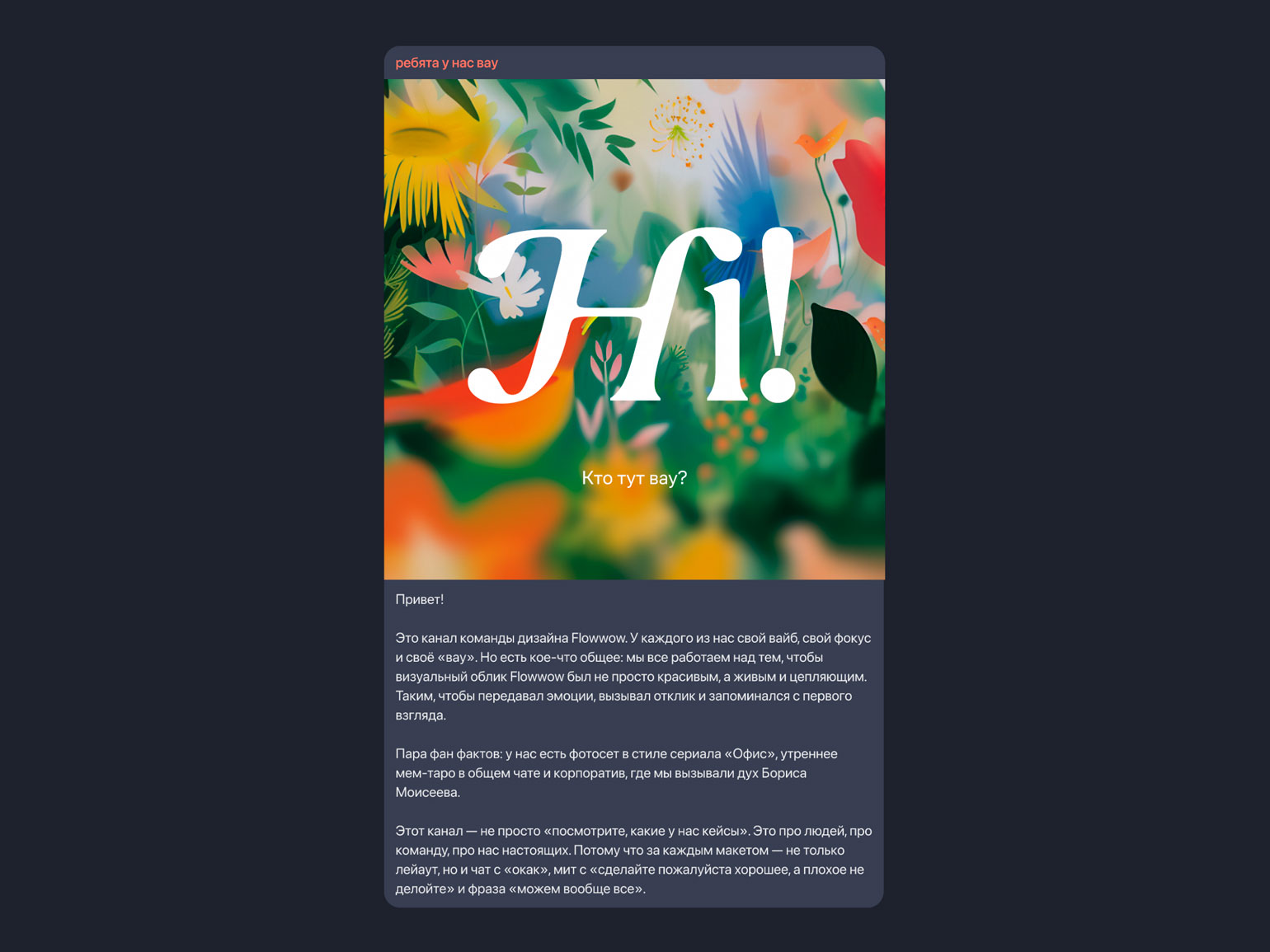 Мы осознали: чем больше становилась компания, тем меньше мы делились своими достижениями. Поэтому мы пригласили к себе в канал весь коллектив Flowwow: в результате коллеги-заказчики стали приходить к нам, показывать кейсы из нашего же канала и просить сделать что-то похожее.
